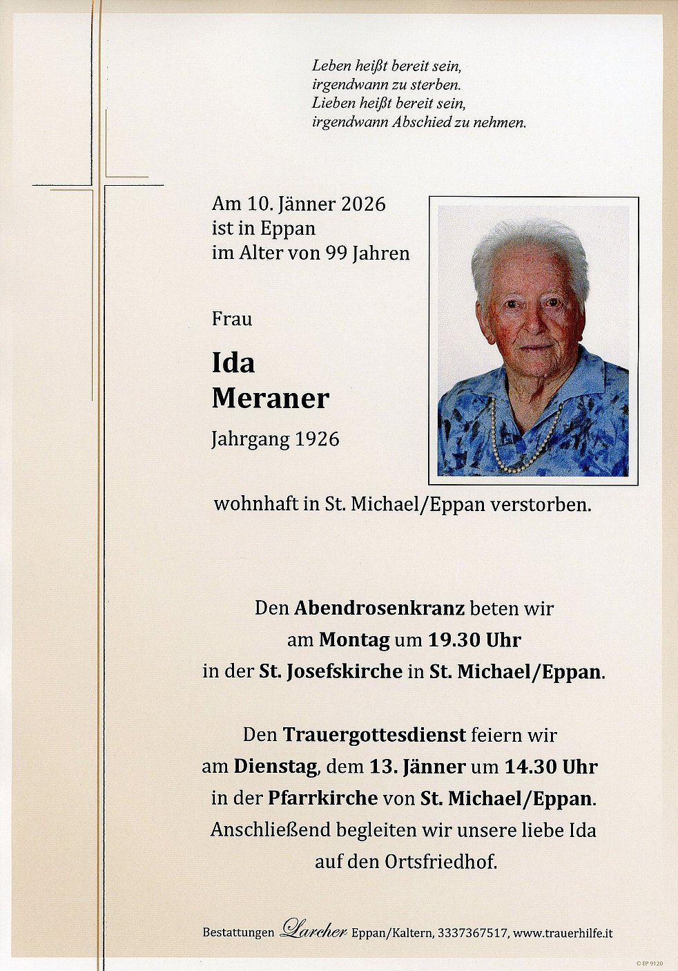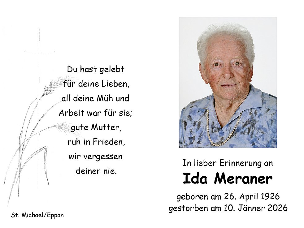 Den Trauergottesdienst feiern wir am Dienstag, dem 13. Jänner, um 14.30 Uhr in der Pfarrkirche von St. Michael/Eppan. Anschließend begleiten wir unsere liebe Ida auf den Ortsfriedhof.