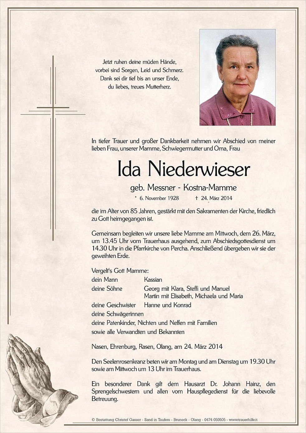 Gemeinsam begleiten wir unsere liebe Mamme am Mittwoch, dem 26. März, um 13.45 Uhr vom Trauerhaus ausgehend, zum Abschiedsgottesdienst um 14.30 Uhr in die Pfarrkirche von Percha. Anschließend übergeben wir sie der geweihten Erde.