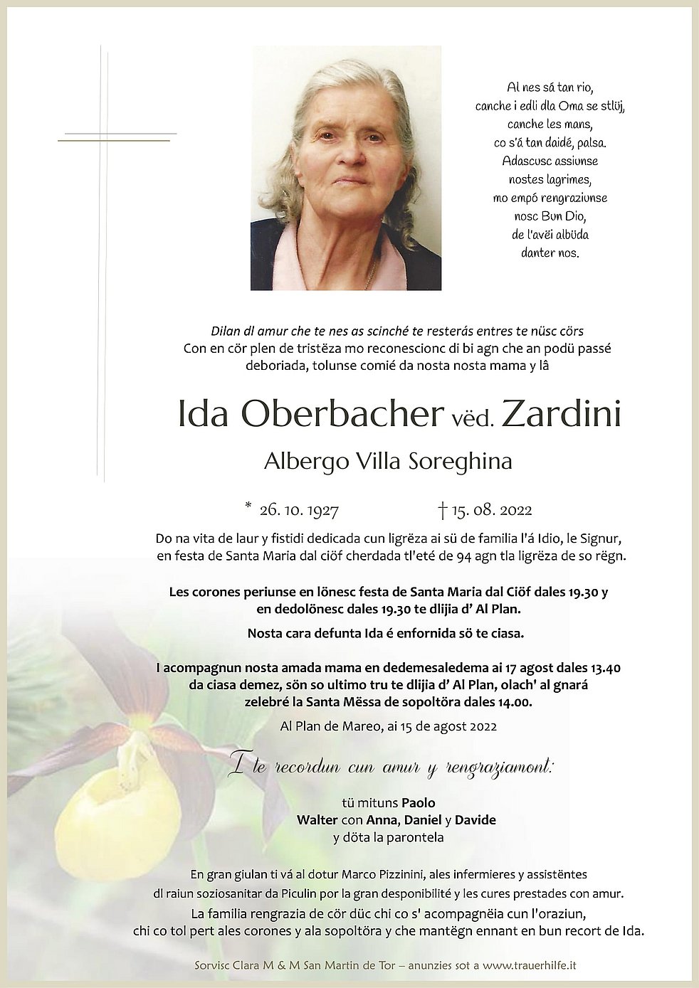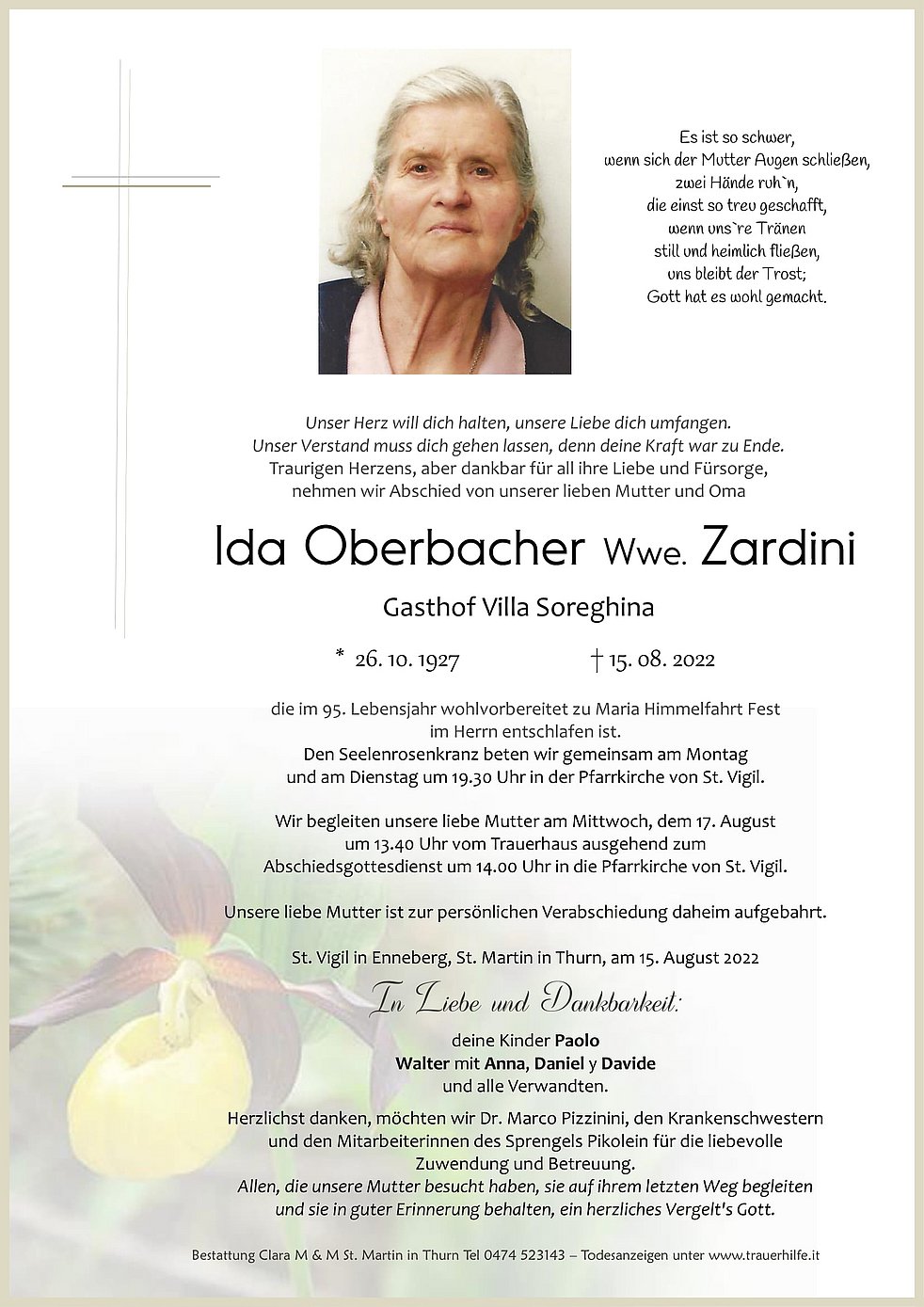 Wir begleiten unsere liebe Mutter am Mittwoch, dem 17. August um 13.40 Uhr vom Trauerhaus ausgehend zum Abschiedsgottesdienst um 14.00 Uhr in die Pfarrkirche von St. Vigil.