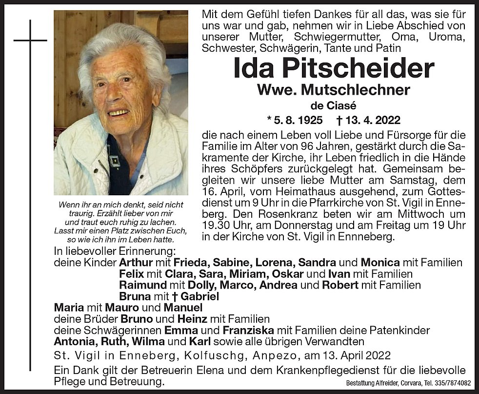 Gemeinsam begleiten wir unsere liebe Mutter am Samstag, dem 16. April, vom Heimathaus ausgehend, zum Gottesdienst um 9.00 Uhr in die Pfarrkirche von St. Vigil in Enneberg.