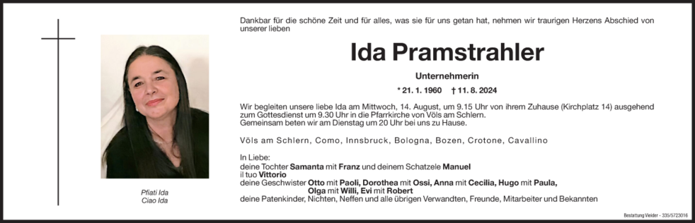 Wir begleiten unsere liebe Ida am Mittwoch, 14. August, um 9.15 Uhr vom ihrem Zuhause (Kirchplatz 14) ausgehend zum Gottesdienst um 9.30 Uhr in die Pfarrkirche von Völs am Schlern.
