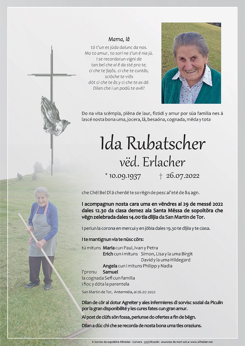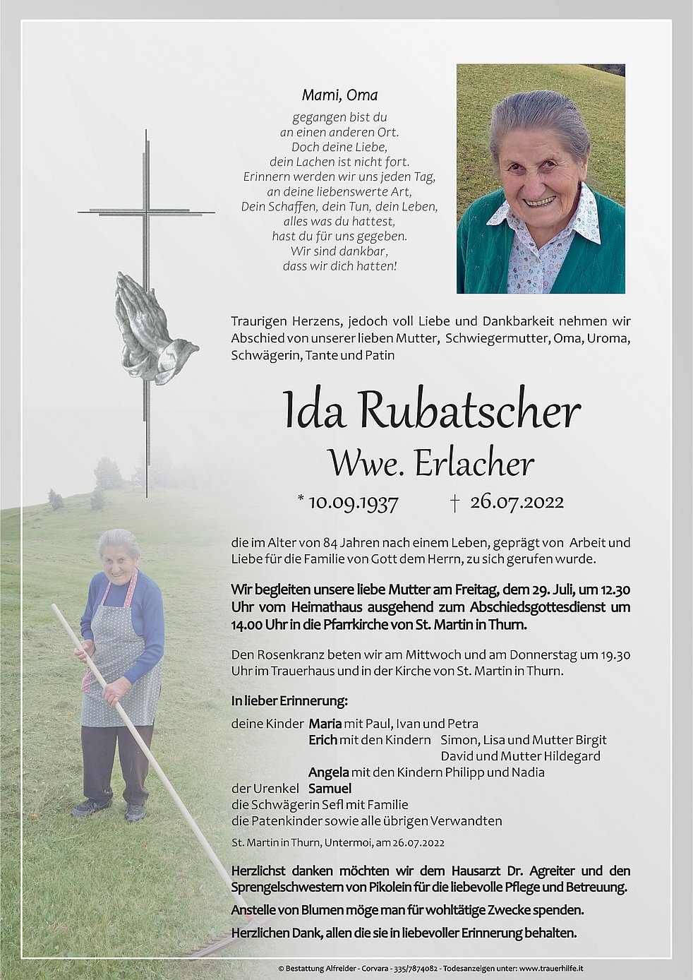 Wir begleiten unsere liebe Mutter am Freitag, dem 29. Juli, um 12.30 Uhr vom Heimathaus ausgehend zum Abschiedsgottesdienst um 14.00 Uhr in die Pfarrkirche von St. Martin in Thurn.