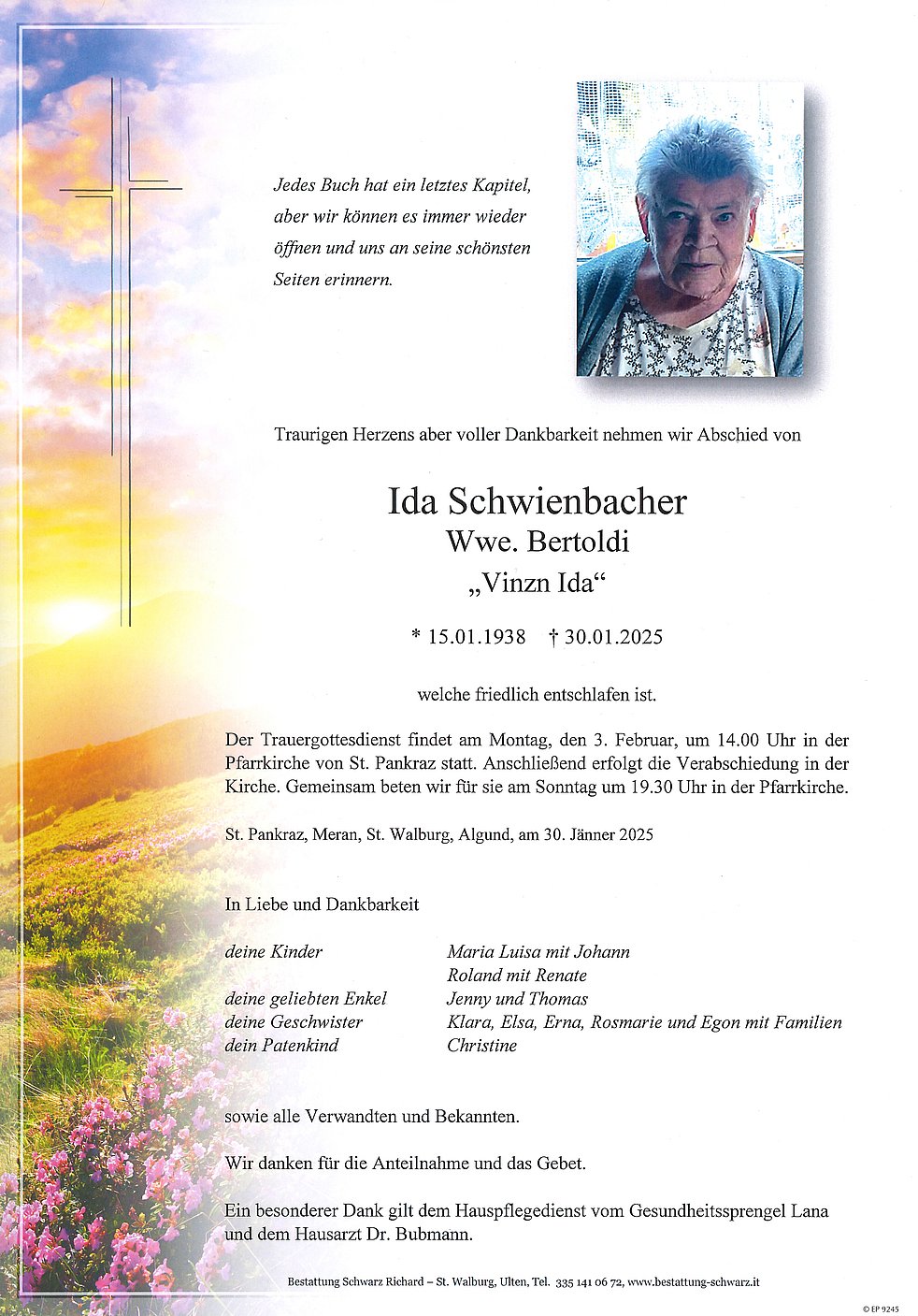 Der Trauergottesdienst findet am Montag, den 3. Februar, um 14.00 Uhr in der Pfarrkirche von St. Pankraz statt. Anschließend erfolgt die Verabschiedung in der Kirche. Gemeinsam beten wir für sie am Sonntag um 19.30 Uhr in der Pfarrkirche.