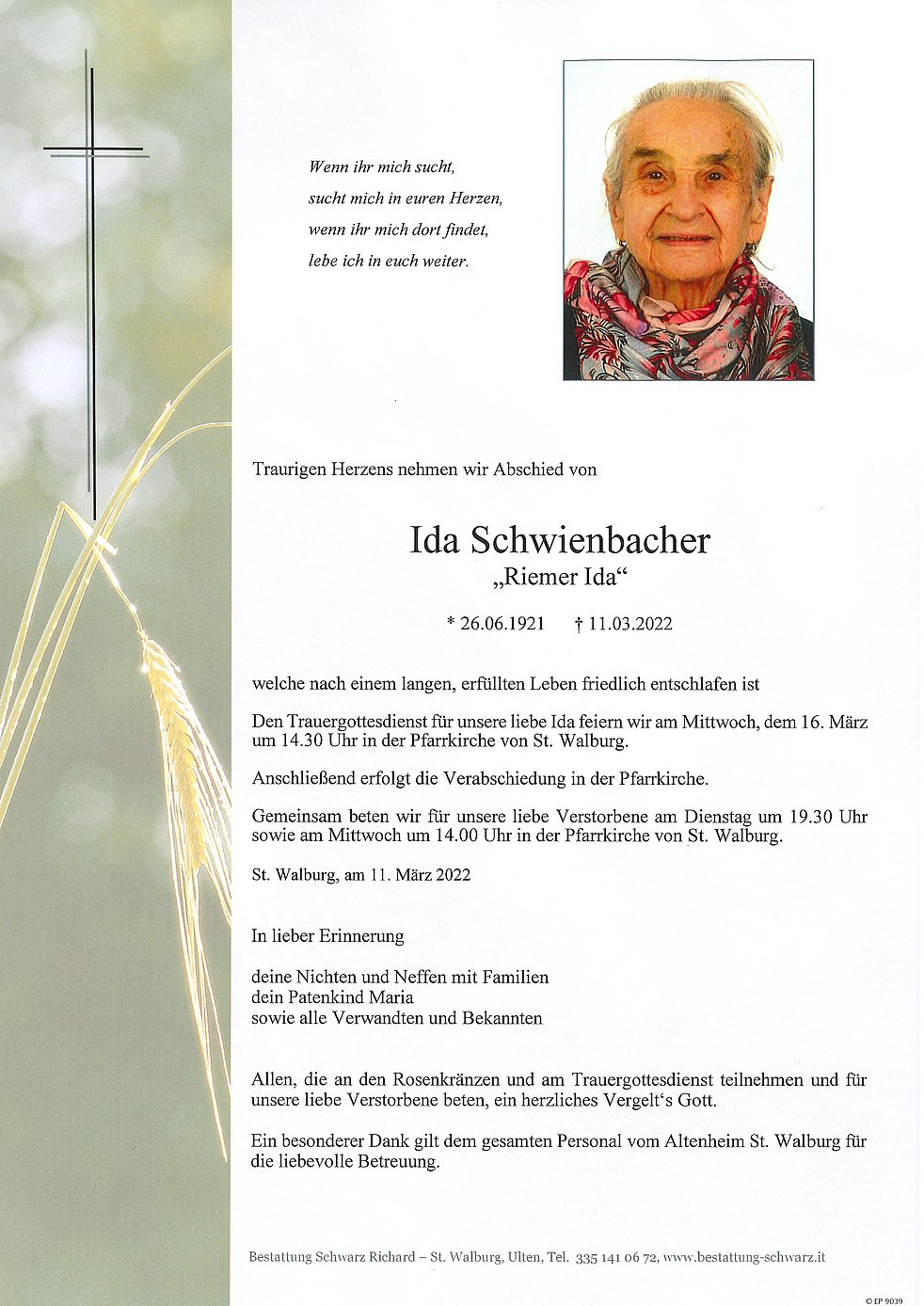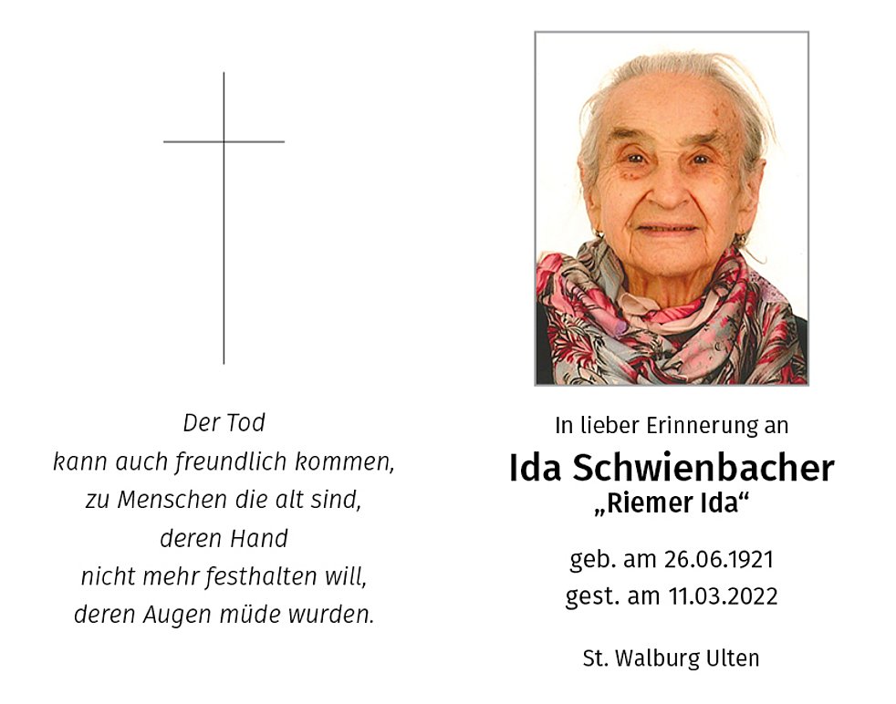 Den Trauergottesdienst für unsere liebe Ida feiern wir am Mittwoch, dem 16. März um 14.30 Uhr in der Pfarrkirche von St. Walburg.