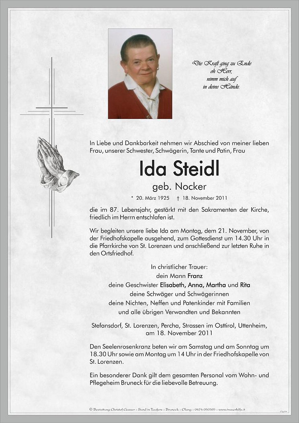 Wir begleiten unsere liebe Ida am Montag, dem 21. November, von der Friedhofskapelle ausgehend, zum Gottesdienst um 14.30 Uhr in die Pfarrkirche von St. Lorenzen und anschließend zur letzten Ruhe in den Ortsfriedhof.