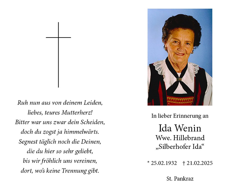 Den Trauergottesdienst feiern wir am Dienstag, den 25. Februar, um 14.00 Uhr in der Pfarrkirche von St. Pankraz. Anschließend verabschieden wir uns von ihr in der Kirche. Den Rosenkranz beten wir am Montag um 19.30 Uhr in der Pfarrkirche.