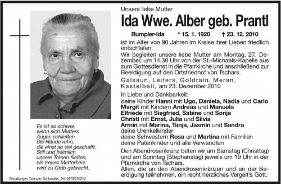 Wir begleiten unsere liebe Mutter am Montag, 27. Dezember, um 14.30 Uhr von der