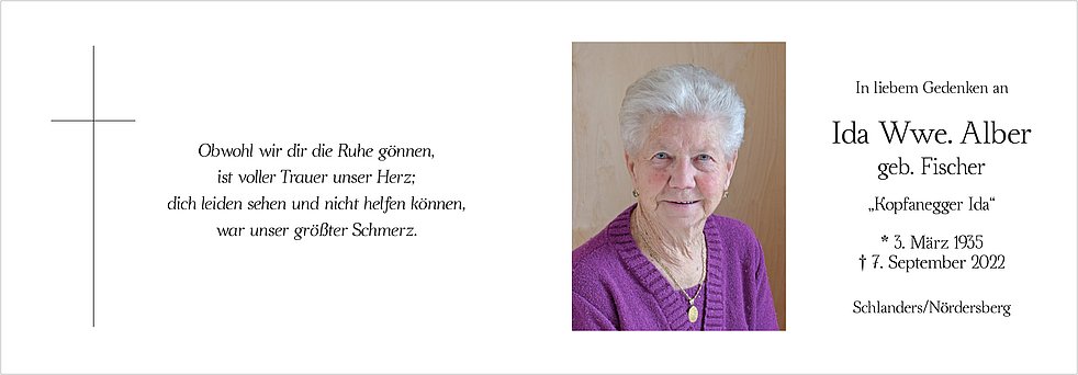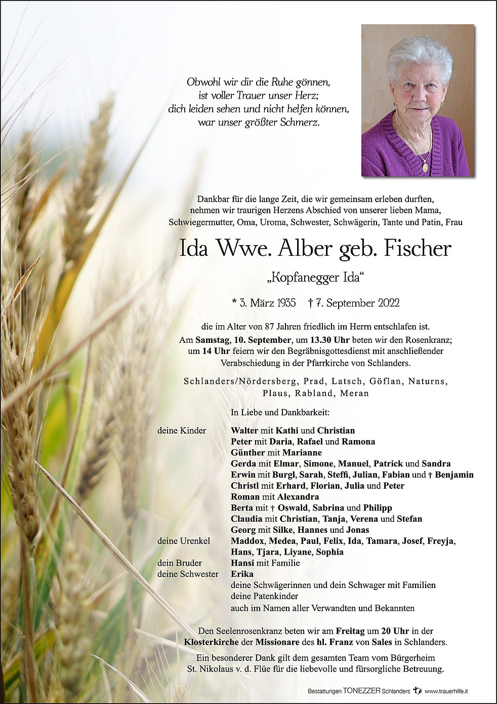 Am Samstag, 10. September, um 13.30 Uhr beten wir den Rosenkranz; um 14 Uhr feiern wir den Begräbnisgottesdienst mit anschließender Verabschiedung in der Pfarrkirche von Schlanders.