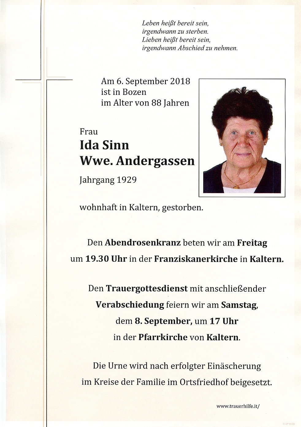 die nach kurzer Krankheit friedlich im Kreise ihrer Lieben entschlafen ist. Den Trauergottesdienst mit anschließender Verabschiedung feiern wir am Samstag, dem 8. September um 17 Uhr in der Pfarrkirche von Kaltern. Die Urne wird im engsten Kreise der Familie im Familiengrab beigesetzt.