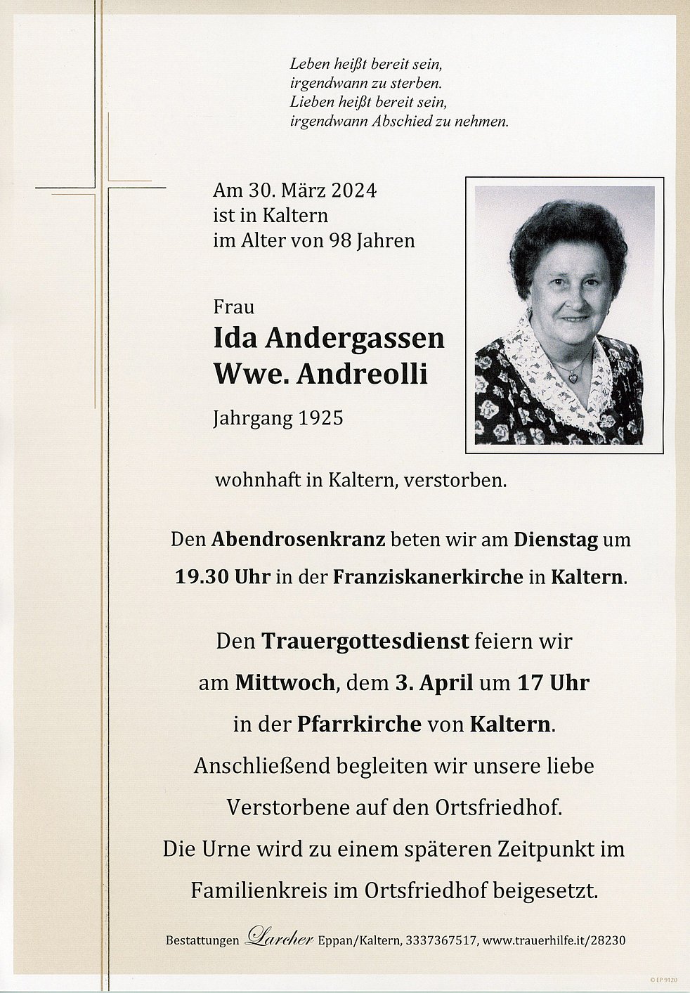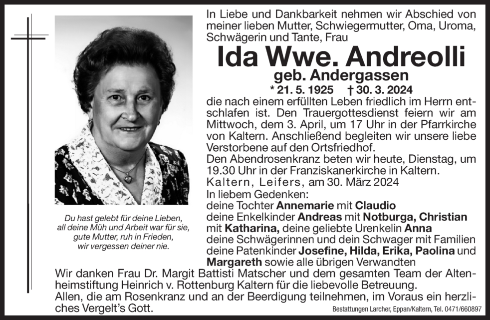 Den Trauergottesdienst feiern wir am Mittwoch, dem 3. April um 17 Uhr in der Pfarrkirche von Kaltern. Anschließend begleiten wir unsere Liebe Verstorbene auf den Ortsfriedhof.
