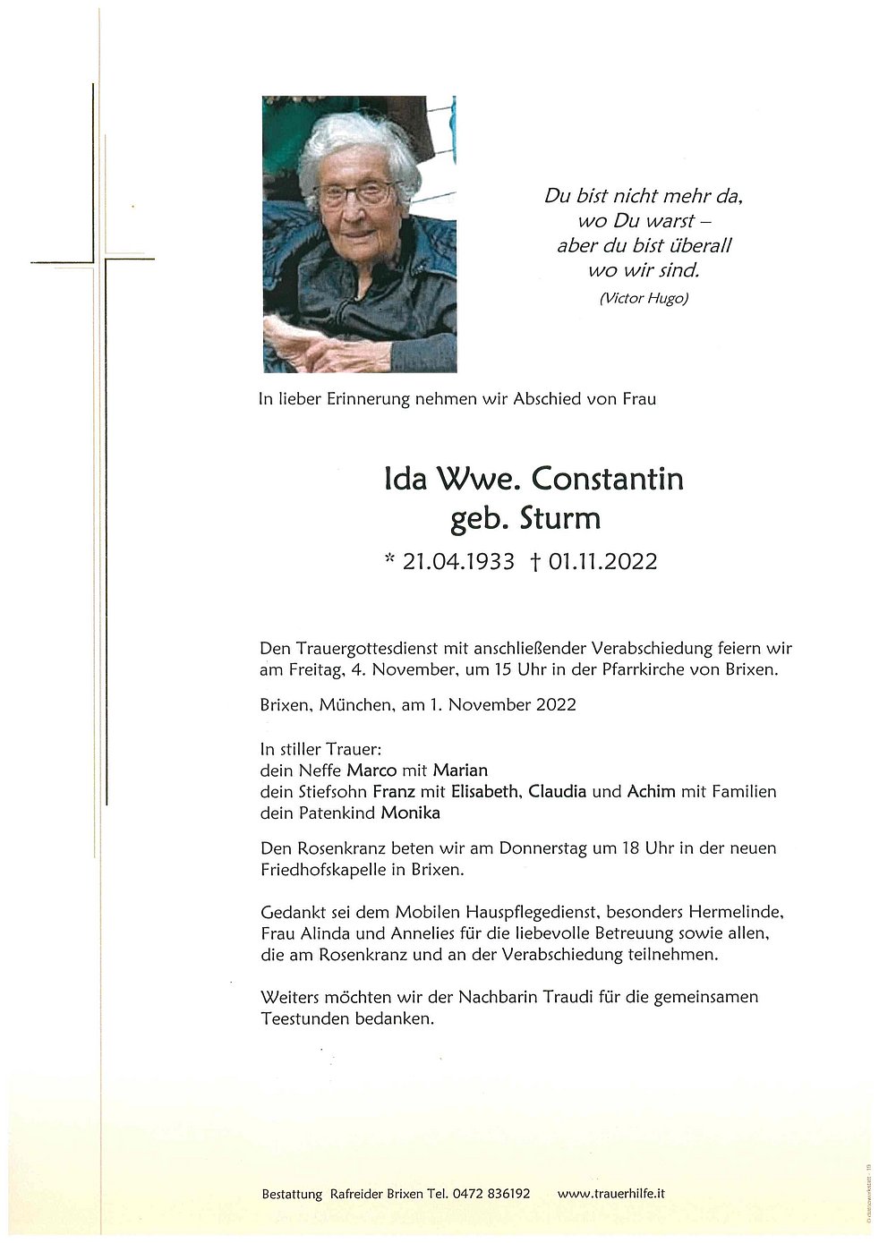Den Trauergottesdienst mit anschließender Verabschiedung feiern wir am Freitag, 4. November, um 15 Uhr in der Pfarrkirche von Brixen.