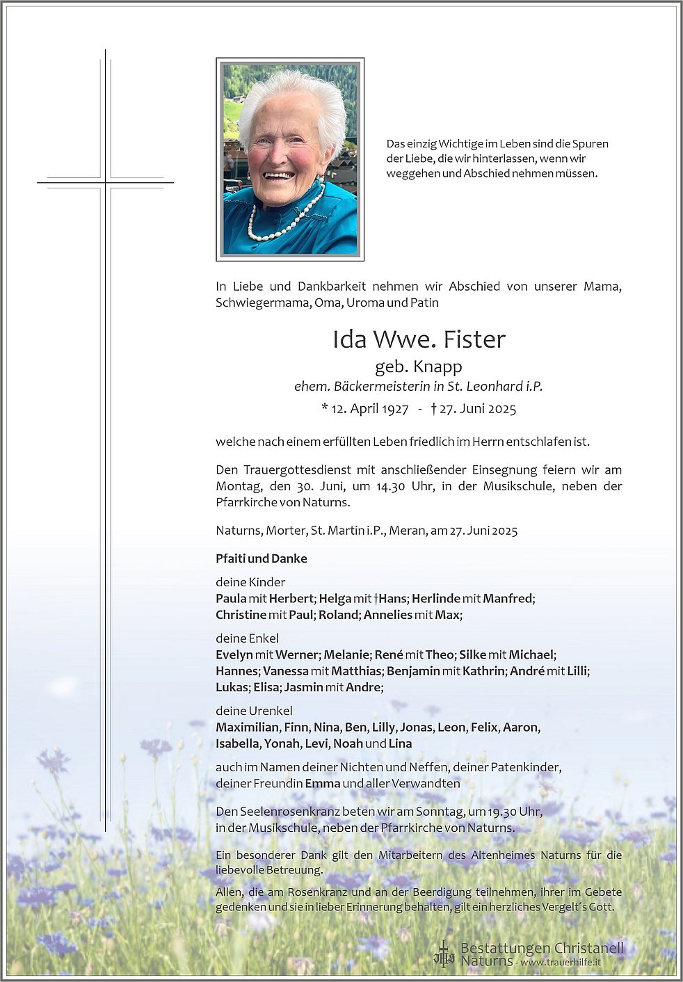 Den Trauergottesdienst mit anschließender Einsegnung feiern wir am Montag, den 30. Juni, um 14.30 Uhr, in der Musikschule, neben der Pfarrkirche von Naturns.