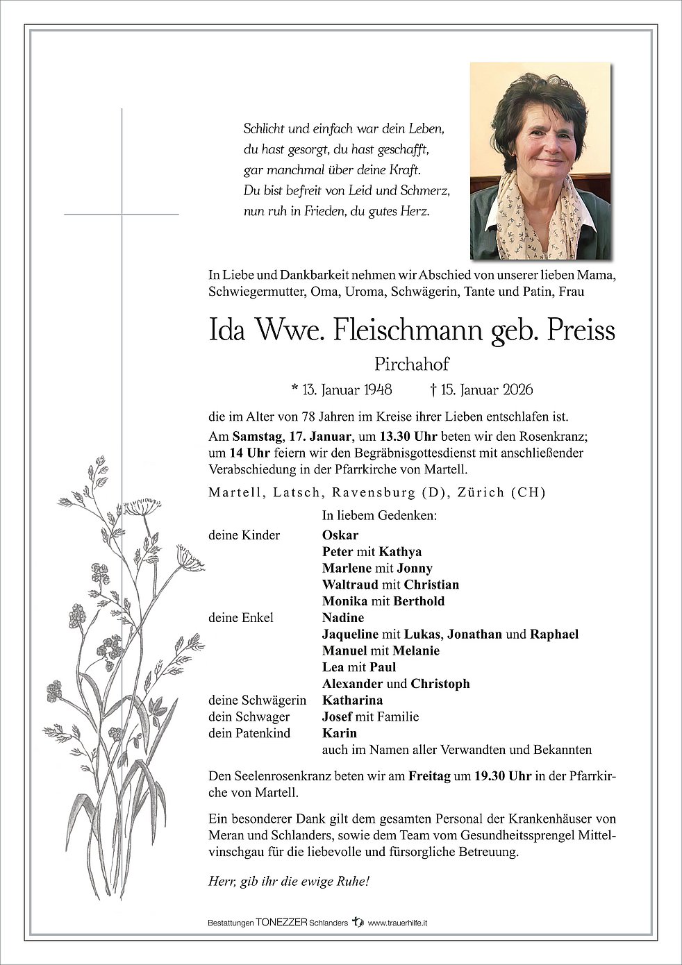 Begräbnisgottesdienst: 17.01. - 14:00 Uhr Pfarrkirche Martell