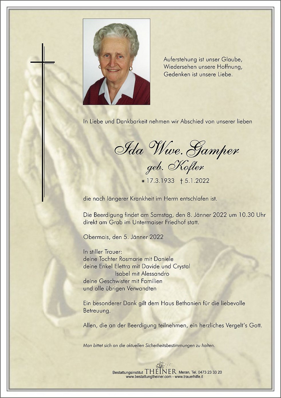 Die Beerdigung findet am Samstag, den 8. Jänner 2022 um 10.30 Uhr direkt am Grab im Untermaiser Friedhof statt.