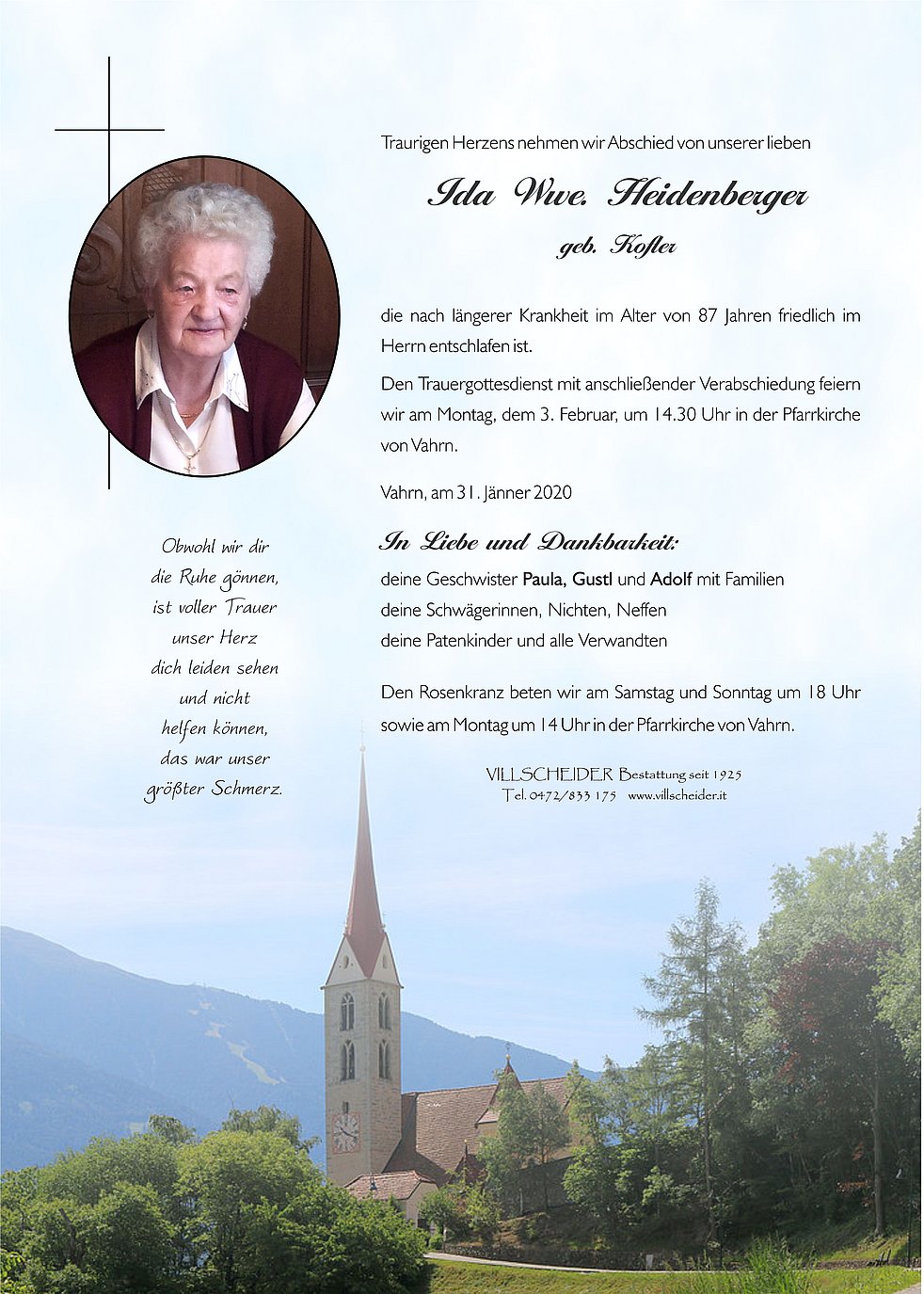 Trauerfeier: 03.02. - 14:30 Uhr Vahrn