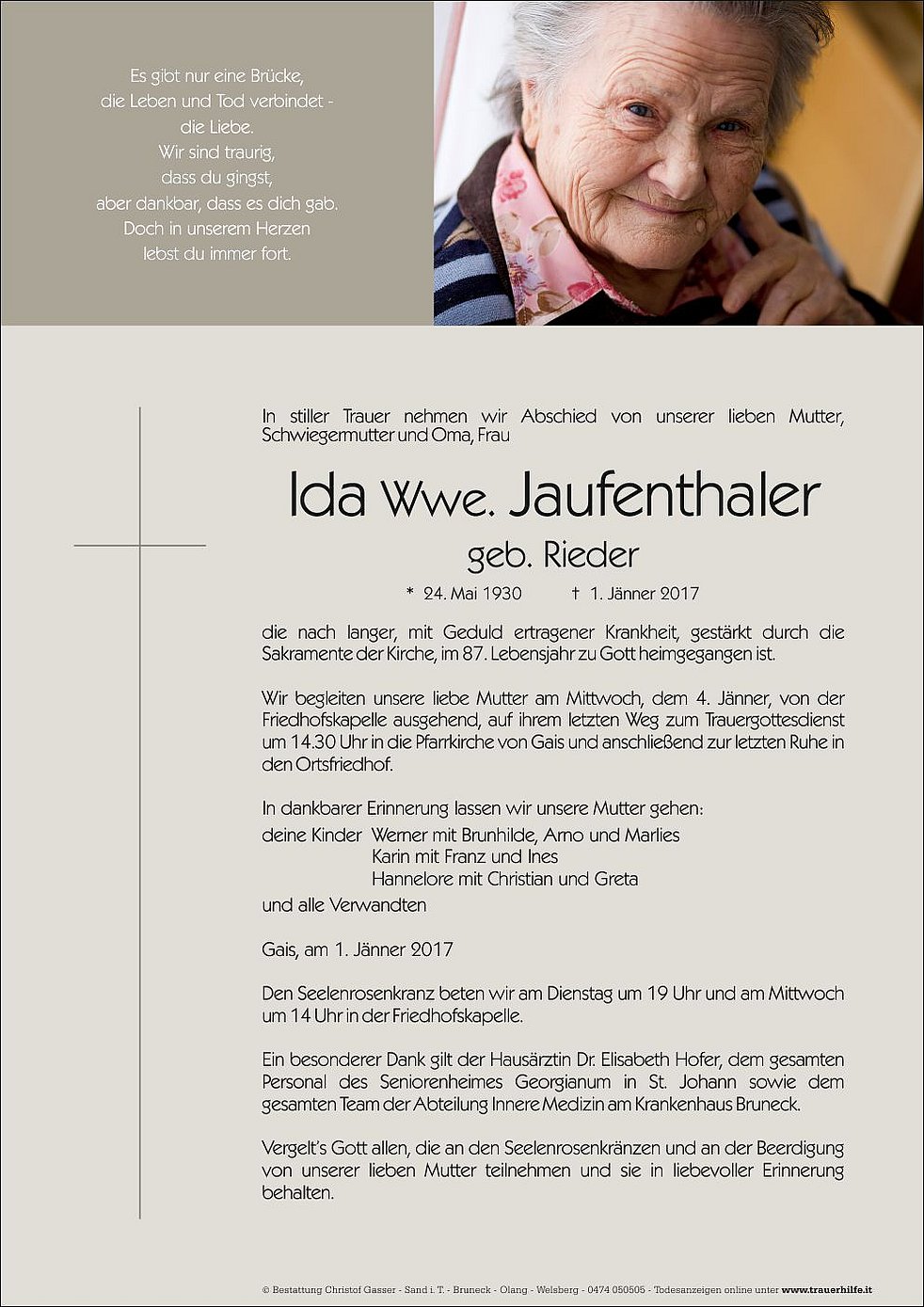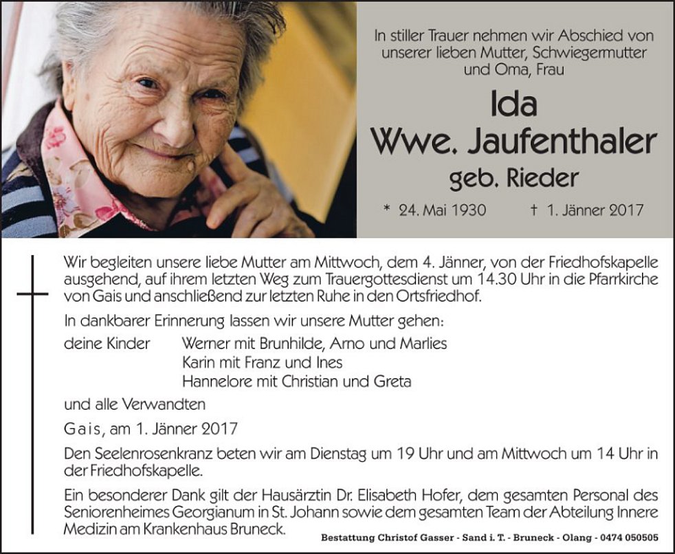 Wir begleiten unsere liebe Mutter am Mittwoch, dem 4. Jänner, von der Friedhofskapelle ausgehend, auf ihrem letzten Weg zum Trauergottesdienst um 14.30 Uhr in die Pfarrkirche von Gais und anschließend zur letzten Ruhe in den Ortsfriedhof.