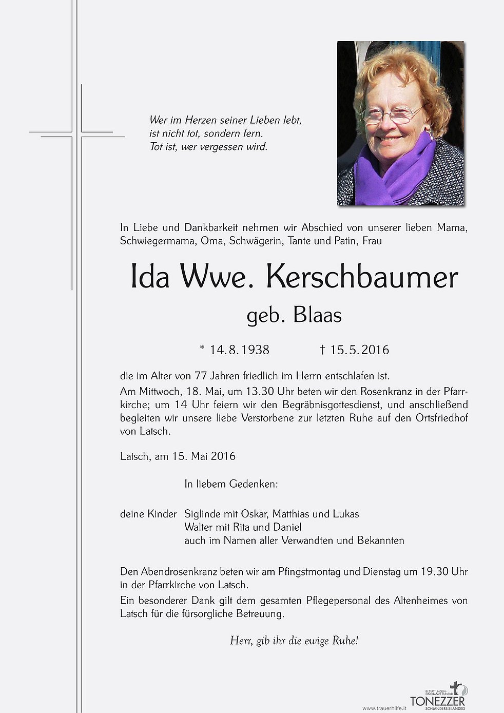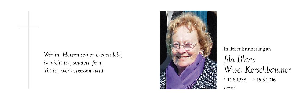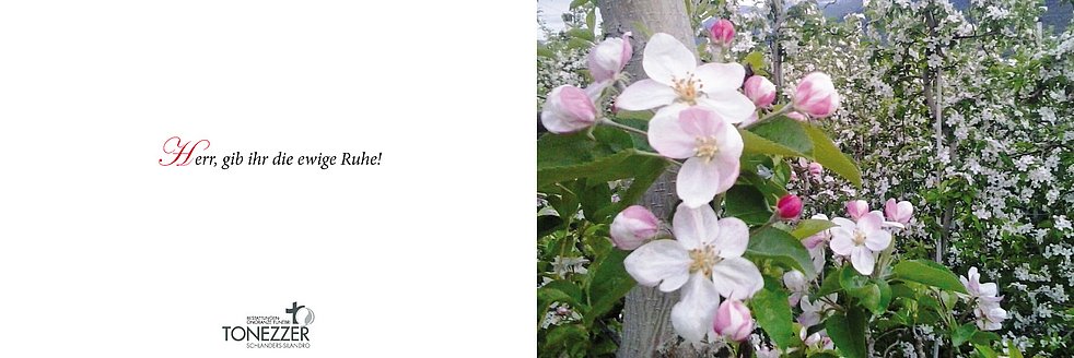 Am Mittwoch, 18. Mai, um 13.30 Uhr beten wir den Rosenkranz in der Pfarrkirche; um 14 Uhr feiern wir den Begräbnisgottesdienst, und anschließend begleiten wir unsere liebe Verstorbene zur letzten Ruhe auf den Ortsfriedhof von Latsch.