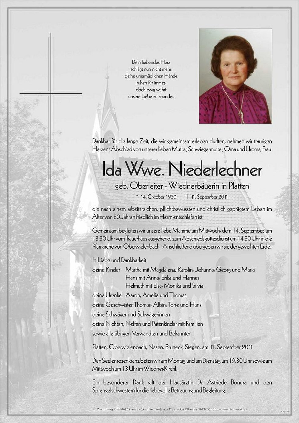 Gemeinsam begleiten wir unsere liebe Mamme am Mittwoch, dem 14. September, um 13.30 Uhr vom Trauerhaus ausgehend, zum Abschiedsgottesdienst um 14.30 Uhr in die Pfarrkirche von Oberwielenbach. Anschließend übergeben wir sie der geweihten Erde.