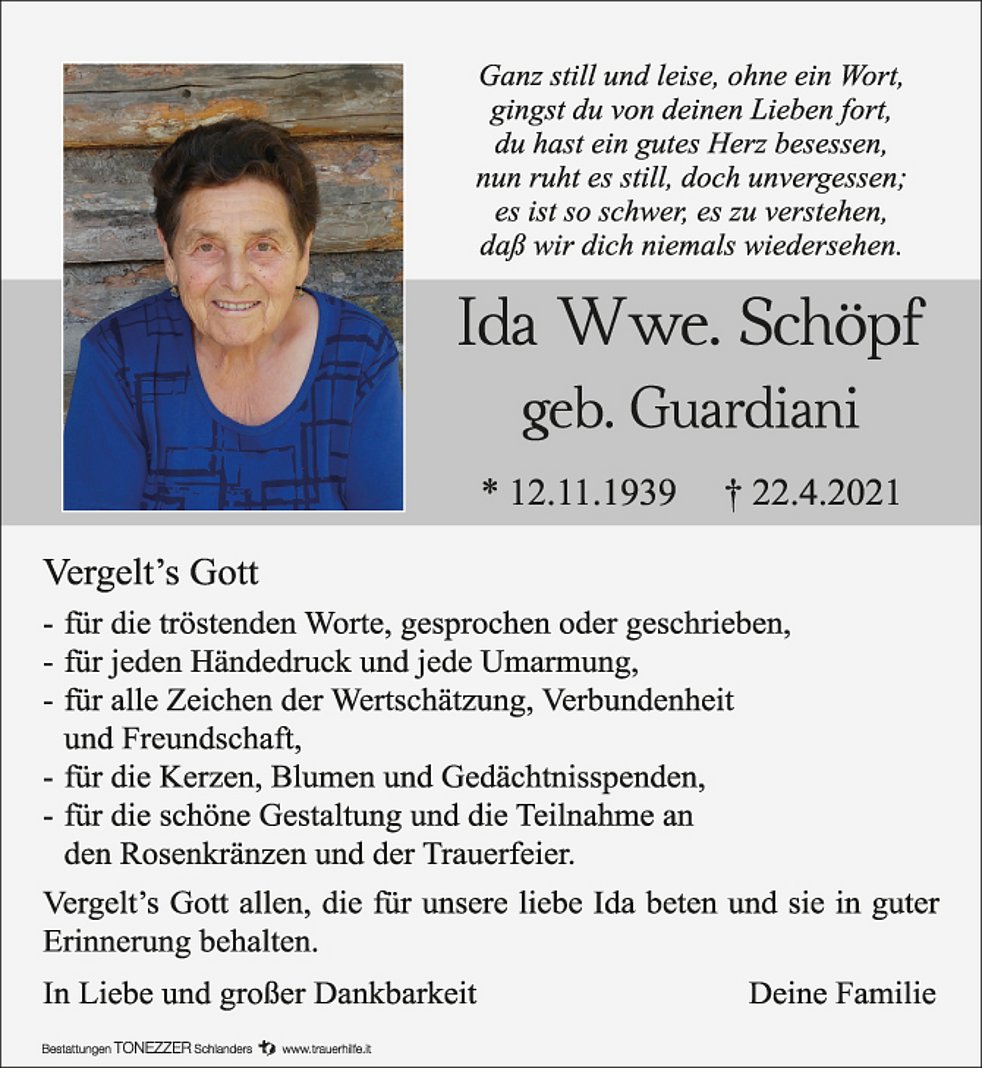 Mit Traurigkeit im Herzen, aber dankbar für die Zeit, die wir gemeinsam verbringen durften, nehmen wir Abschied von unserer lieben Mama, Schwiegermama, Oma, Uroma, Schwester, Schwägerin, Tante, Cousine und Patin, Frau