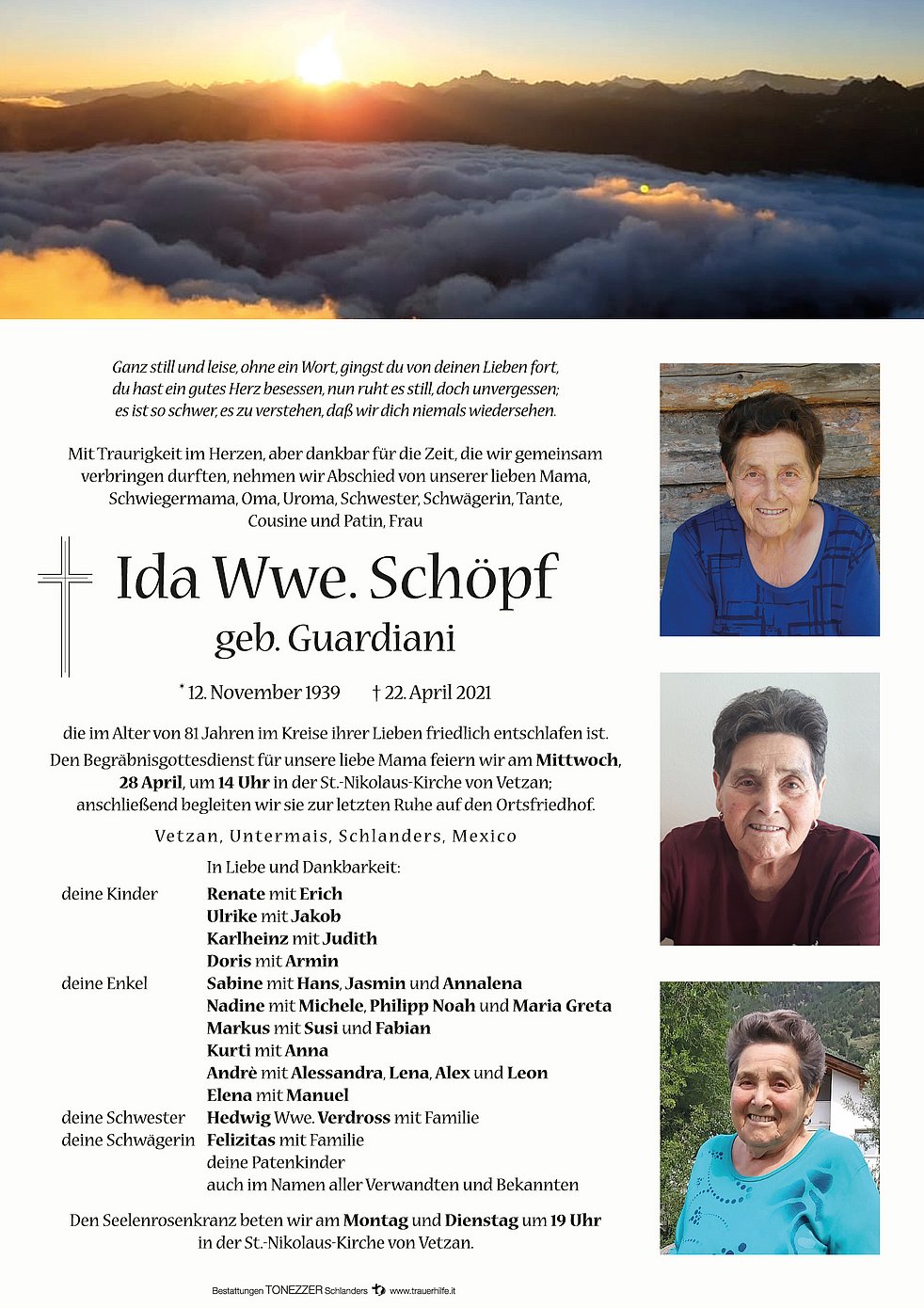 Den Begräbnisgottesdienst für unsere liebe Mama feiern wir am Mittwoch, 28 April, um 14 Uhr in der St.-Nikolaus-Kirche von Vetzan;