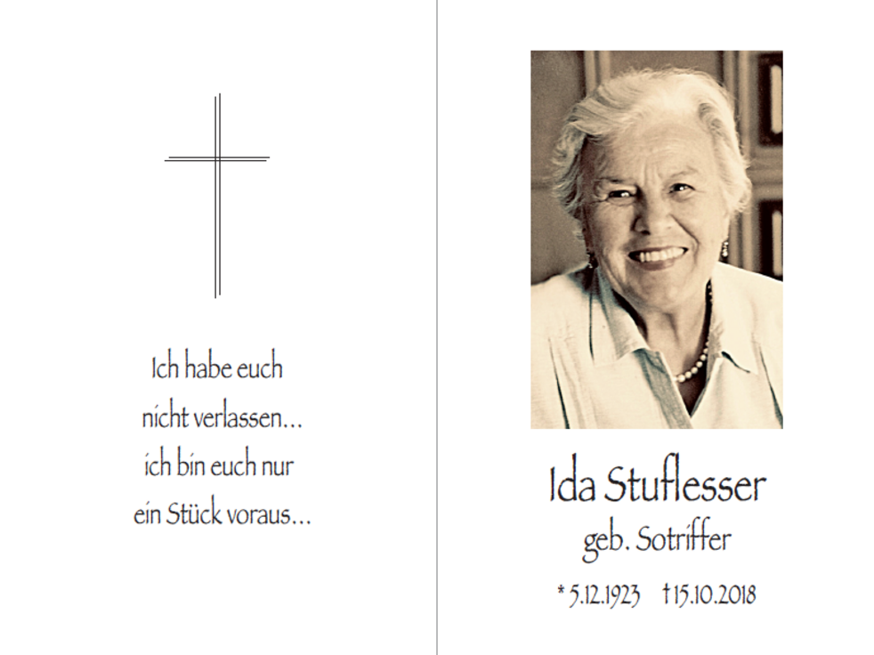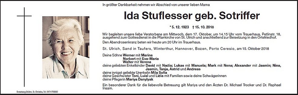 Wir begleiten unsere liebe Verstorbene am Mittwoch, dem 17. Oktober, um 14.15 Uhr, vom Trauerhaus, Petlinstr. 18, ausgehend zum Gottesdienst in die Pfarrkirche von St. Ulrich und anschließend zur Beisetzung in den Ortsfriedhof.