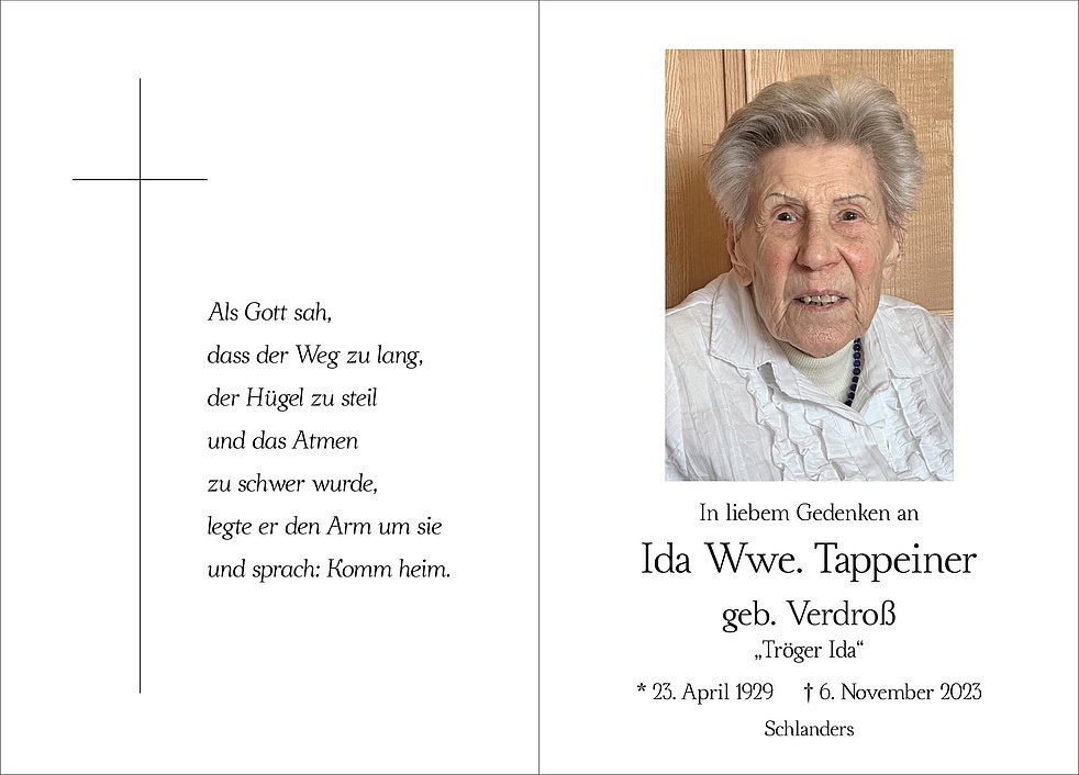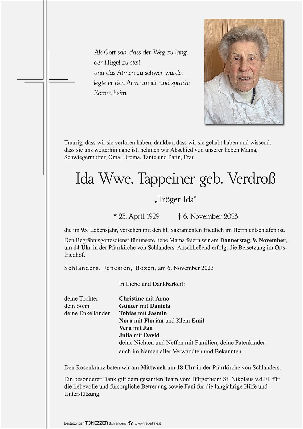 Begräbnisgottesdienst: 09.11. - 14:00 Uhr Pfarrkirche Schlanders