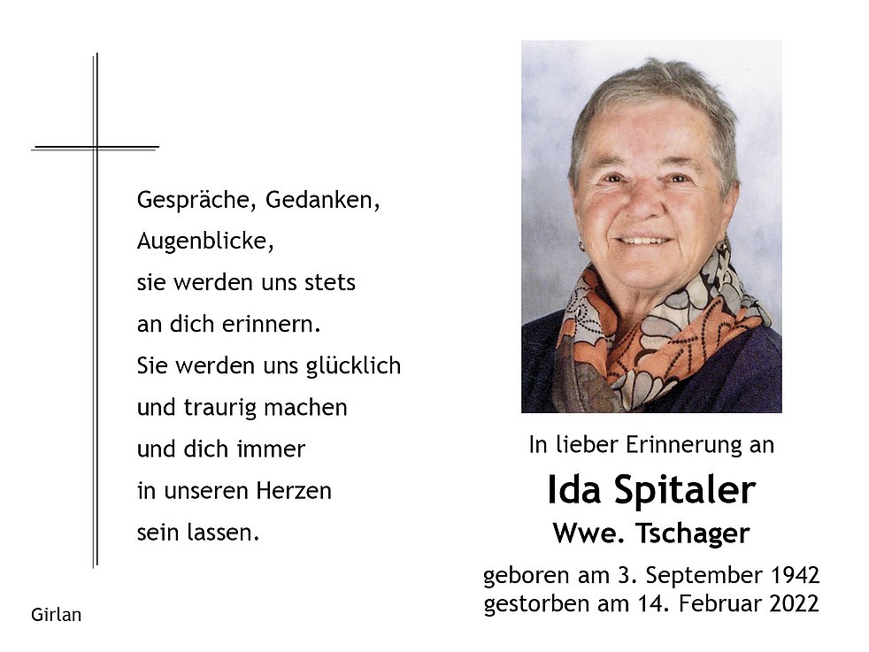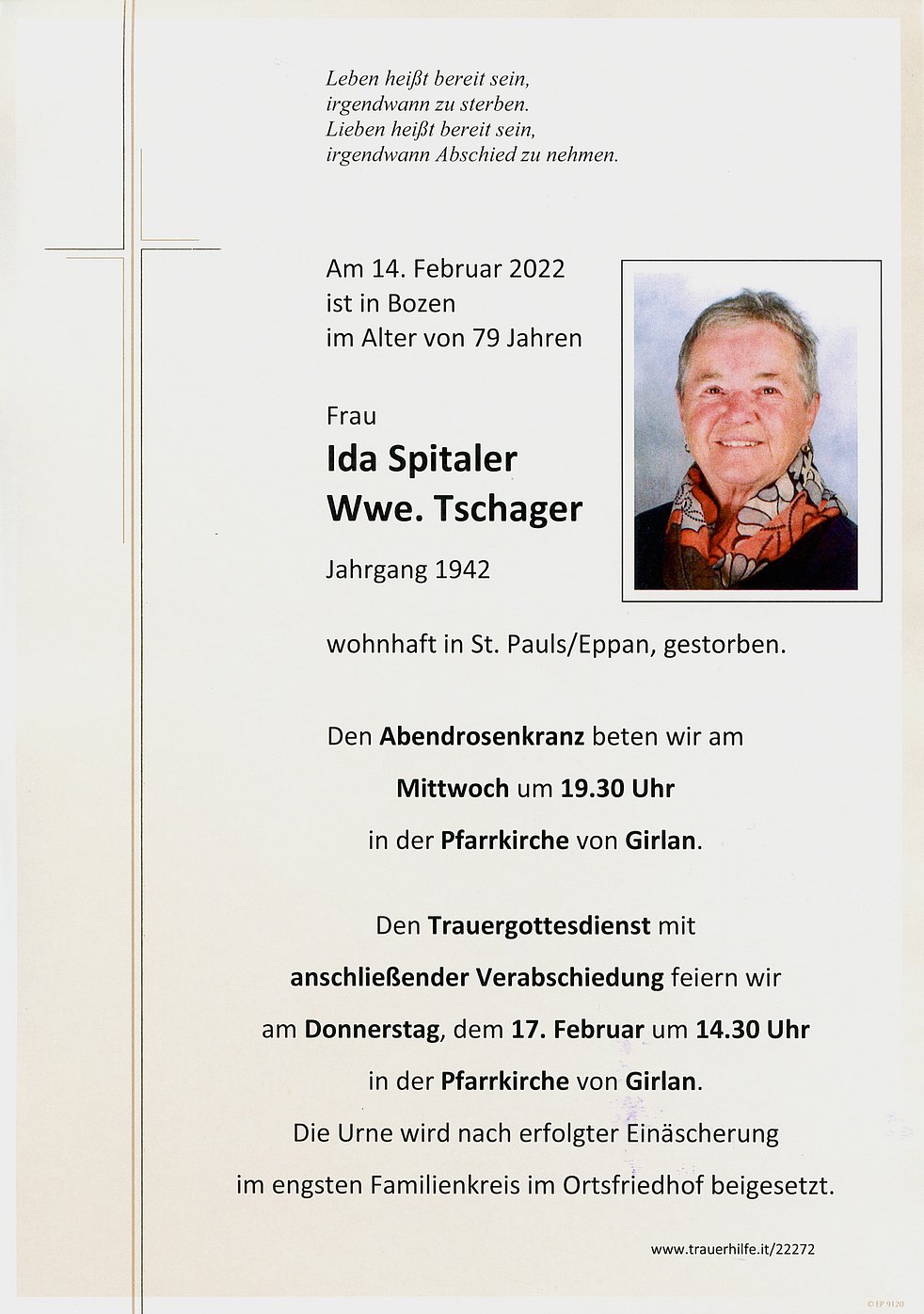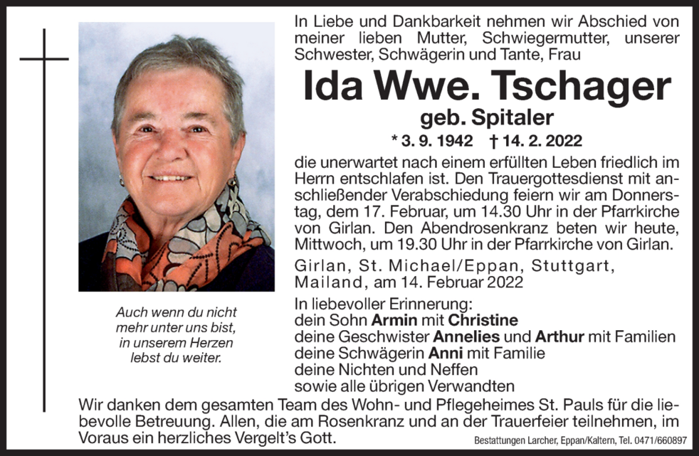 Den Trauergottesdienst mit anschließender Verabschiedung feiern wir am Donnerstag, dem 17. Februar um 14.30 Uhr in der Pfarrkirche von Girlan.