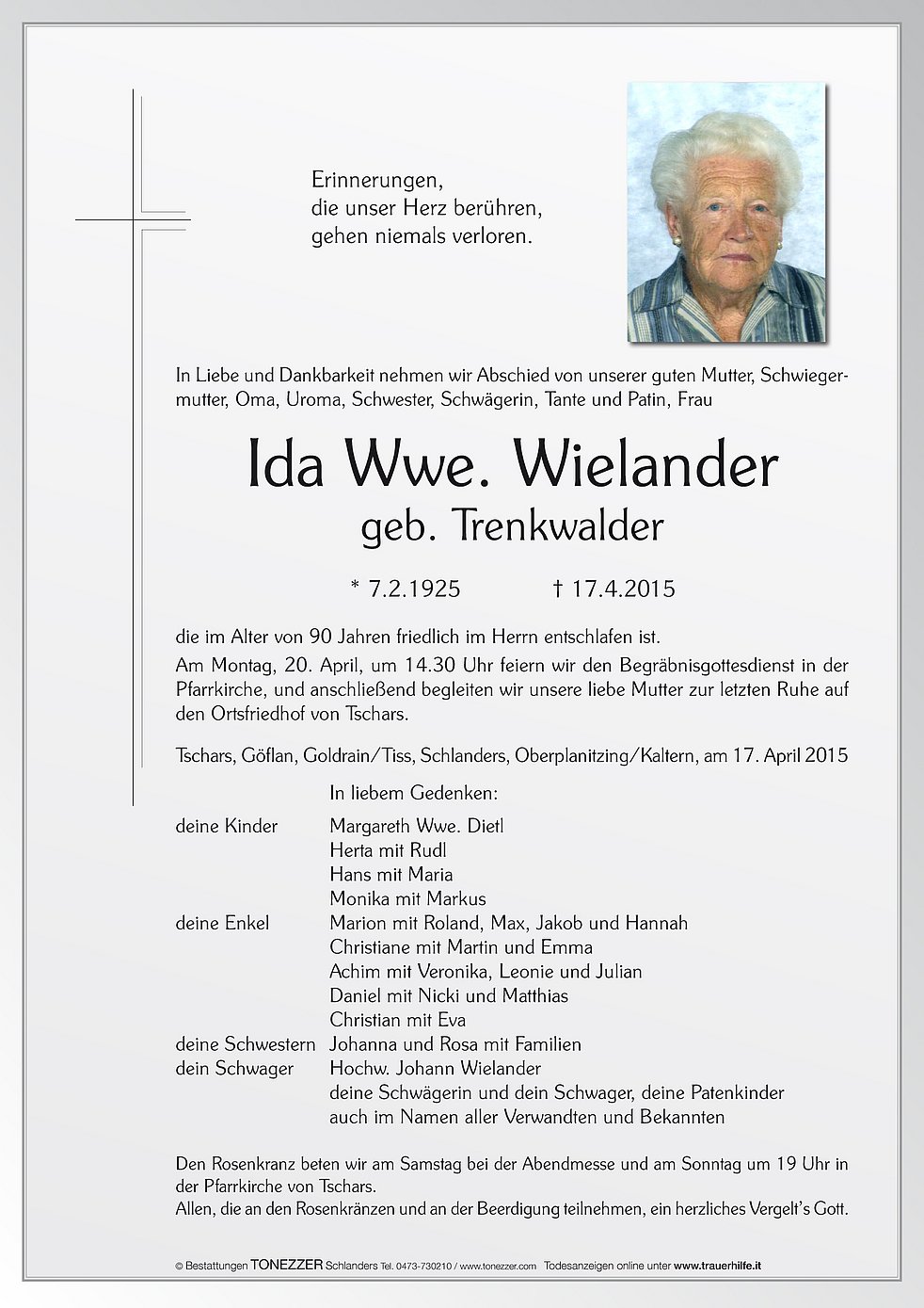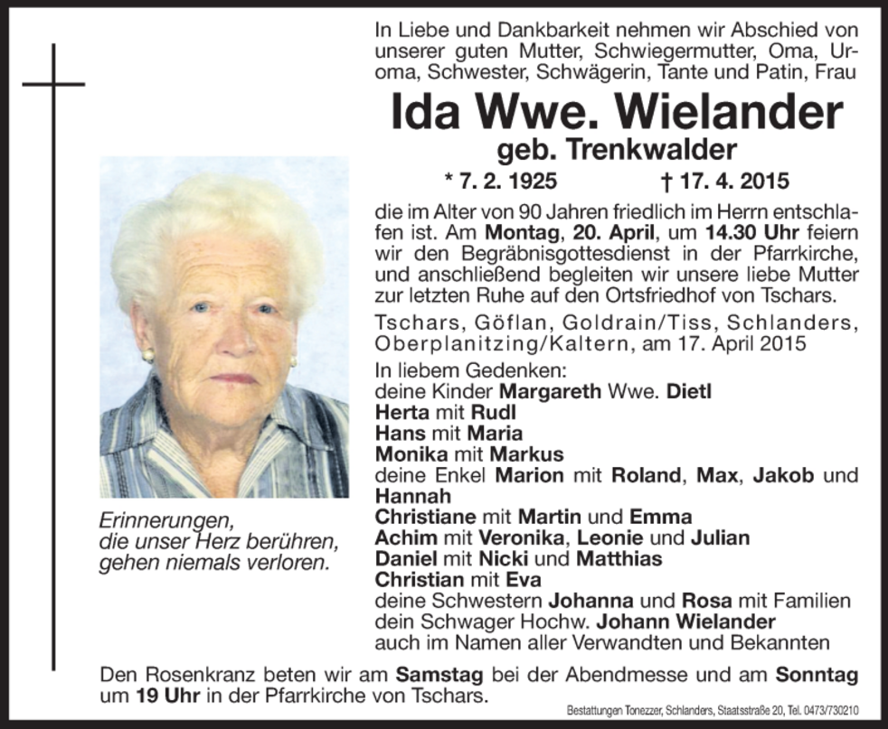 Am Montag, 20. April, um 14.30 Uhr feiern wir den Begräbnisgottesdienst in der Pfarrkirche, und anschließend begleiten wir unsere liebe Mutter zur letzten Ruhe auf den Ortsfriedhof von Tschars.