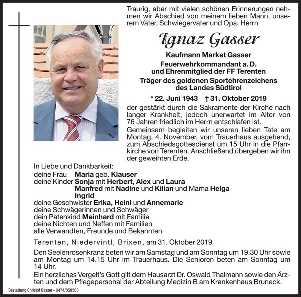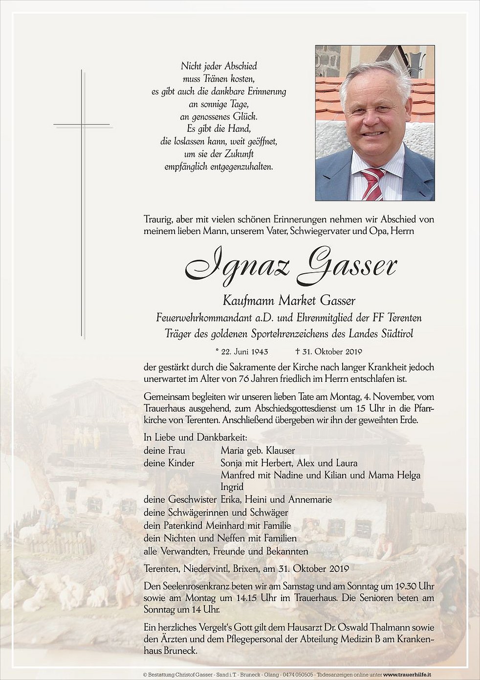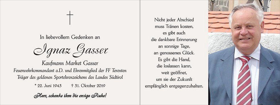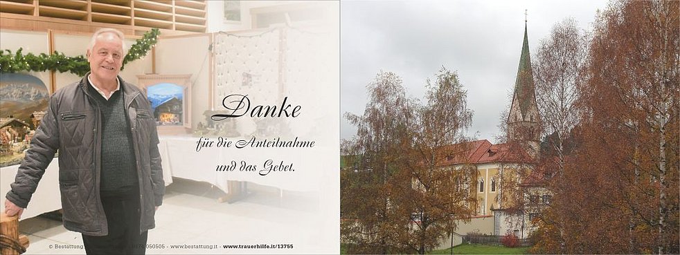 Gemeinsam begleiten wir unseren lieben Tate am Montag, 4. November, vom Trauerhaus ausgehend, zum Abschiedsgottesdienst um 15 Uhr in die Pfarr-kirche von Terenten. Anschließend übergeben wir ihn der geweihten Erde.