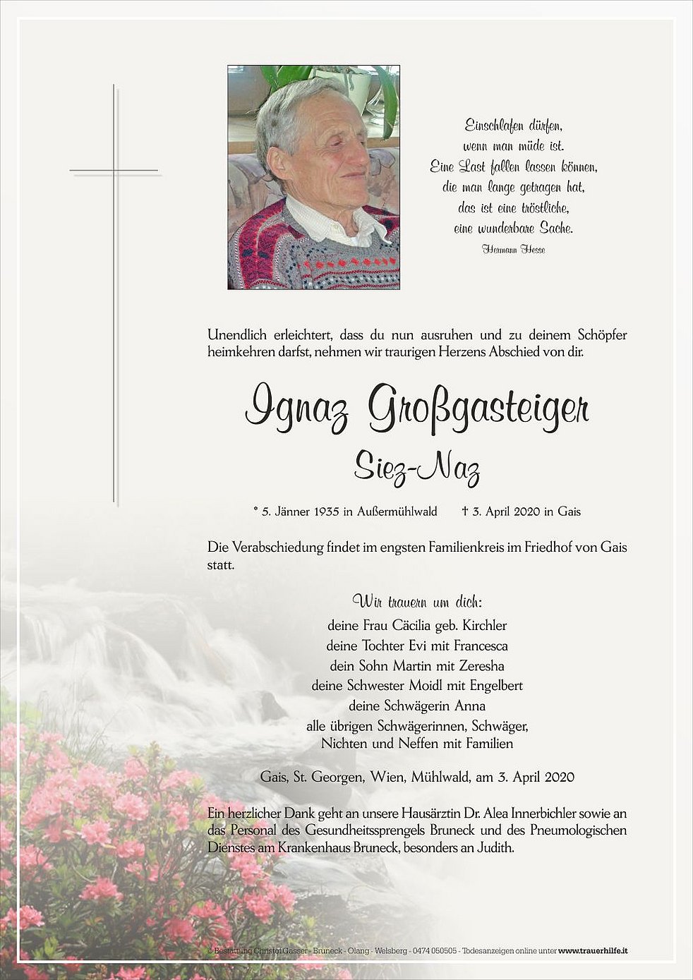 Die Verabschiedung findet im engsten Familienkreis im Friedhof von Gais statt.