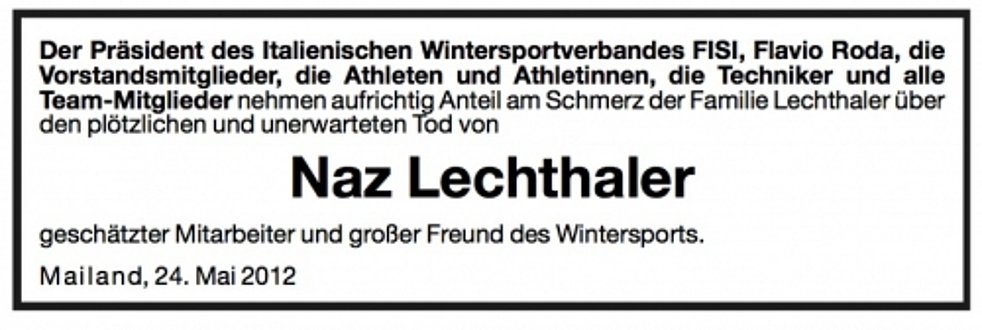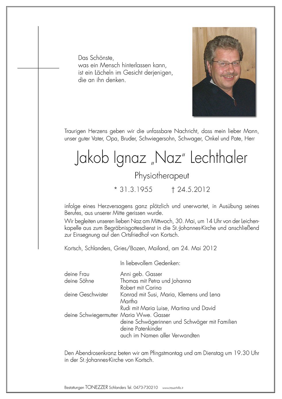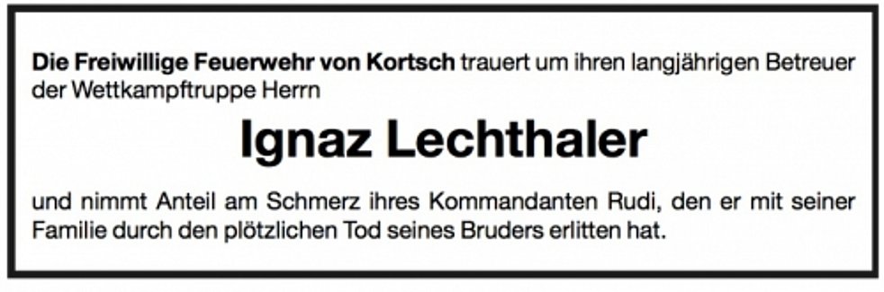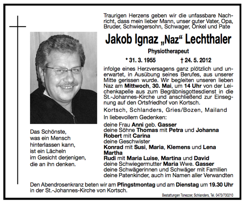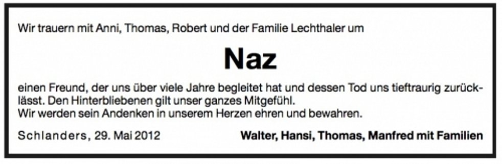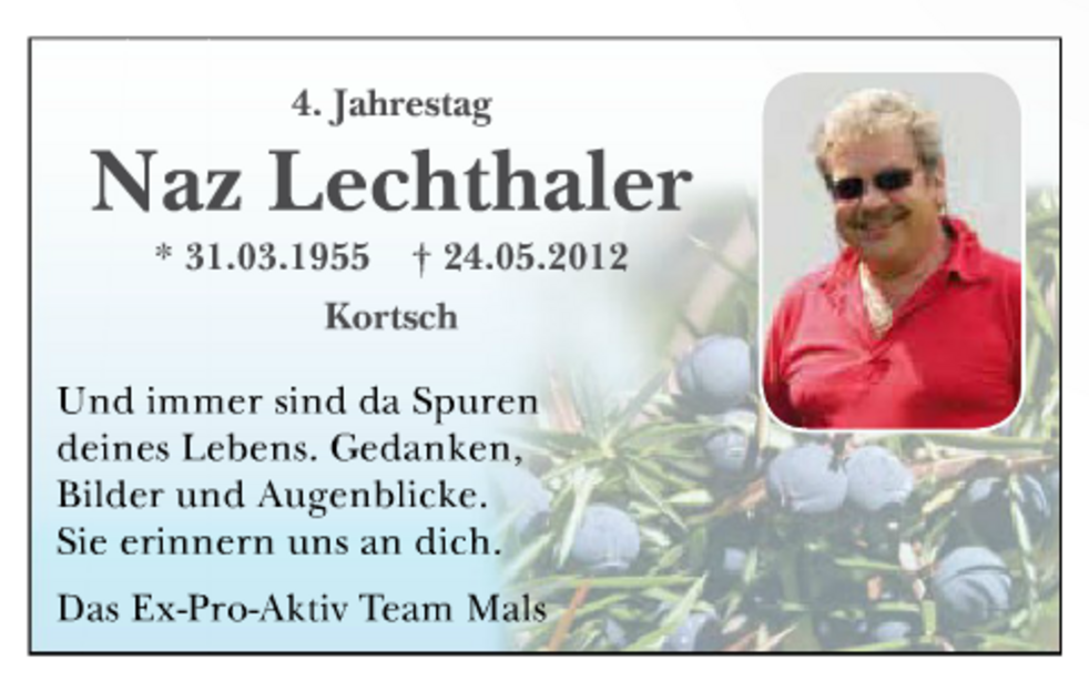 Wir begleiten unseren lieben Naz am Mittwoch, 30. Mai, um 14 Uhr von der Leichenkapelle aus zum Begräbnisgottesdienst in die St.-Johannes-Kirche und anschließend zur Einsegnung auf den Ortsfriedhof von Kortsch.