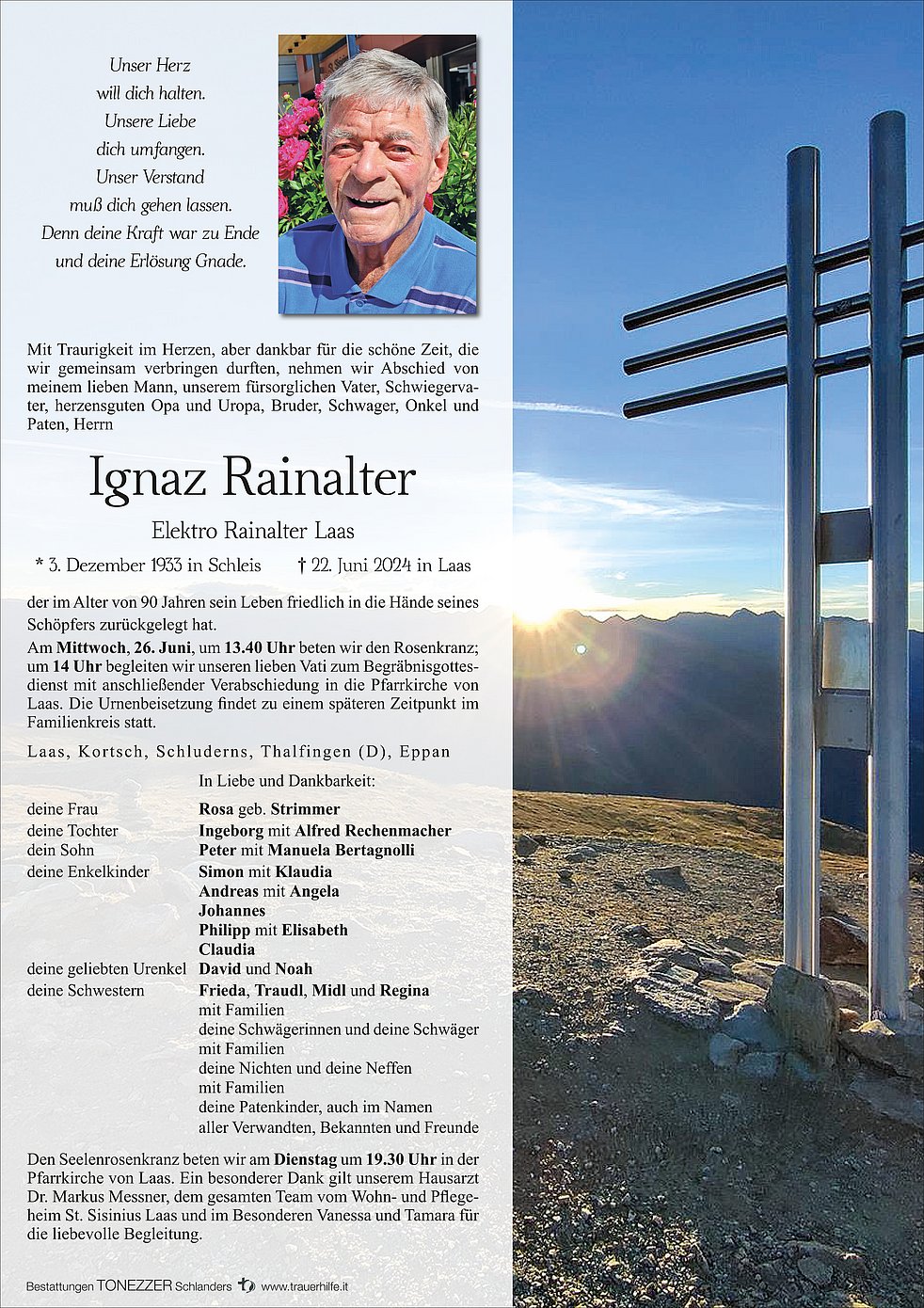 Am Mittwoch, 26. Juni, um 13.40 Uhr beten wir den Rosenkranz; um 14 Uhr begleiten wir unseren lieben Vati zum Begräbnisgottesdienst mit anschließender Verabschiedung in die Pfarrkirche von Laas. Die Urnenbeisetzung findet zu einem späteren Zeitpunkt im Familienkreis statt.