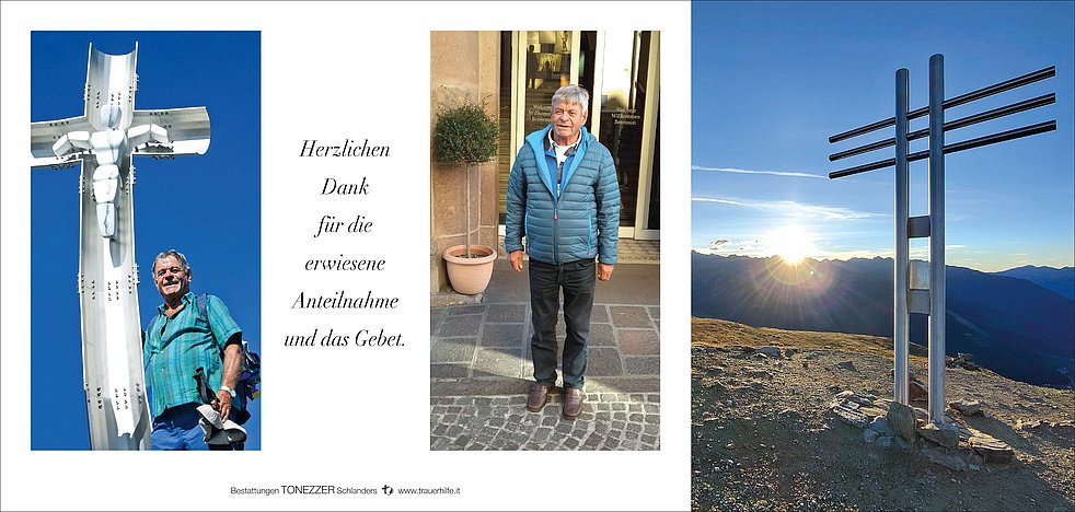 Ein besonderer Dank gilt unserem Hausarzt Dr. Markus Messner, dem gesamten Team vom Wohn- und Pflegeheim St. Sisinius Laas und im Besonderen Vanessa und Tamara für die liebevolle Begleitung.
