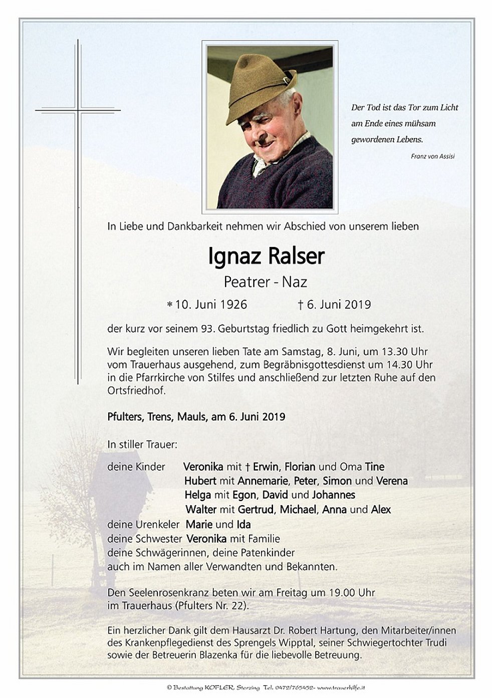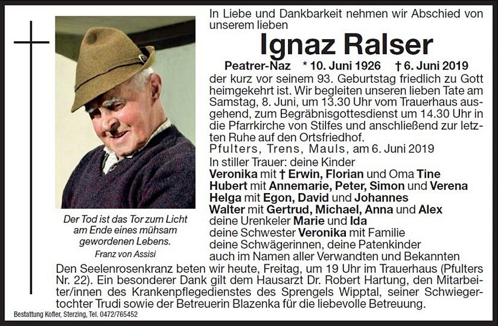 Ein herzlicher Dank gilt dem Hausarzt Dr. Robert Hartung, den Mitarbeiter/innen des Krankenpflegedienst des Sprengels Wipptal, seiner Schwiegertochter Trudi sowie der Betreuerin Blazenka für die liebevolle Betreuung.
