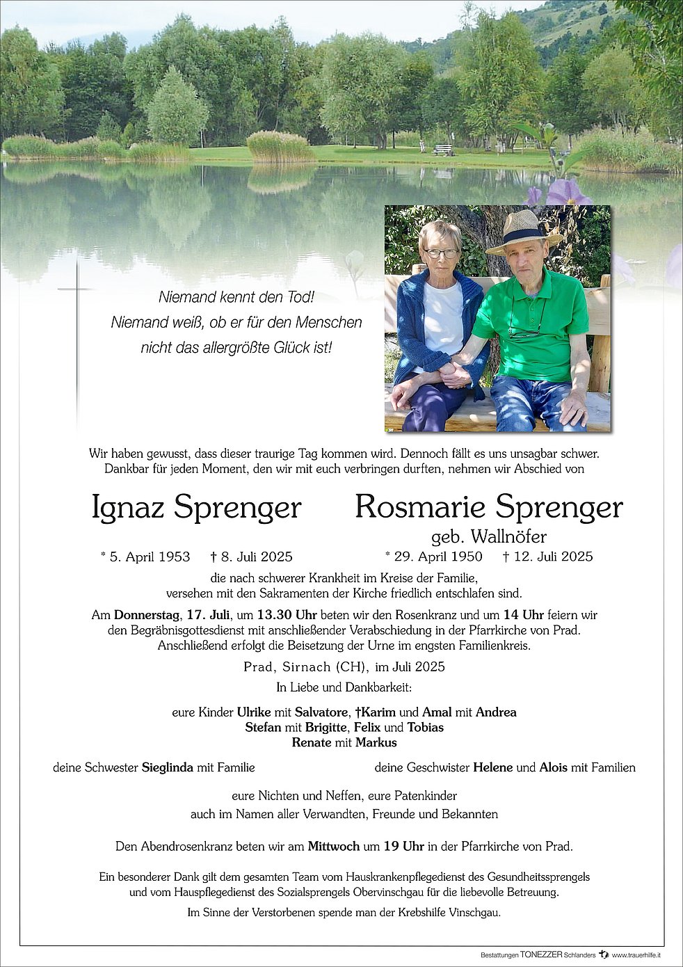 Begräbnisgottesdienst: 17.07. - 14:00 Uhr Pfarrkirche Prad