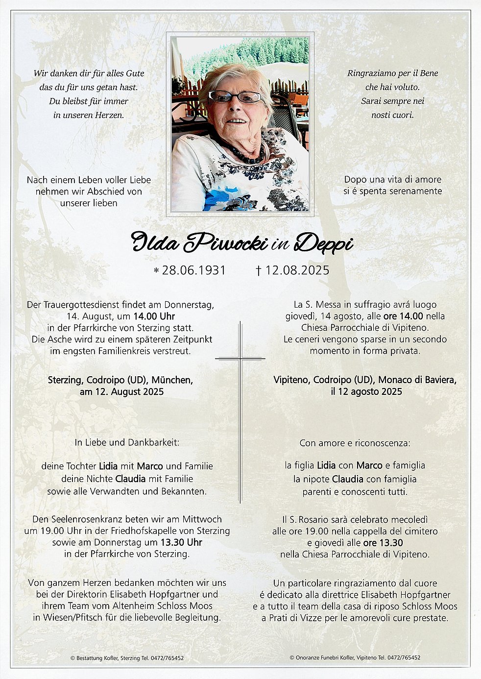 La S. Messa in suffragio avrá luogo giovedì, 14 agosto, alle ore 14.00 nella Chiesa Parrocchiale di Vipiteno. Le ceneri vengono sparse in un secondo momento in forma privata.