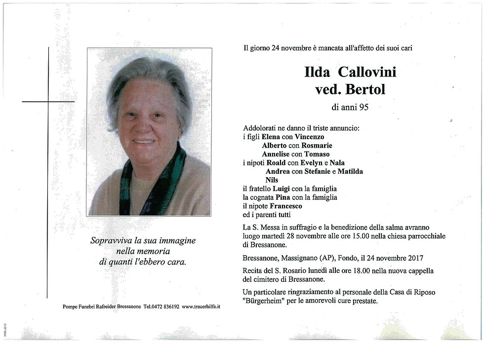 La S. Messa in suffragio e la benedizione della salma avranno luogo martedì 28 novembre alle ore 15.00 nella chiesa parrocchiale di Bressanone.