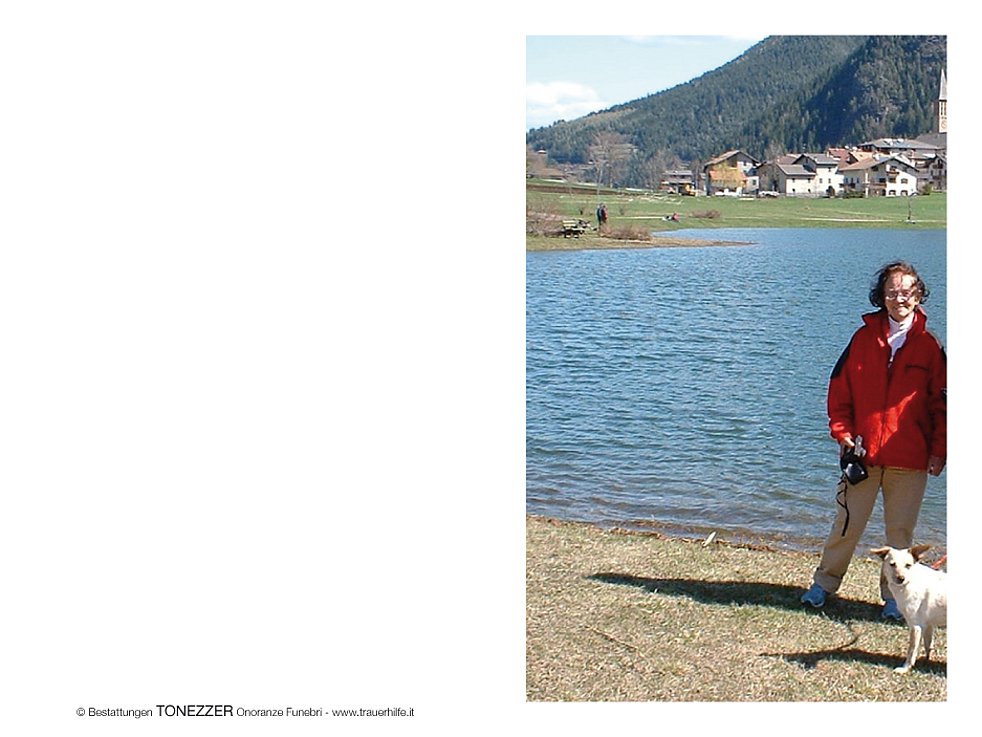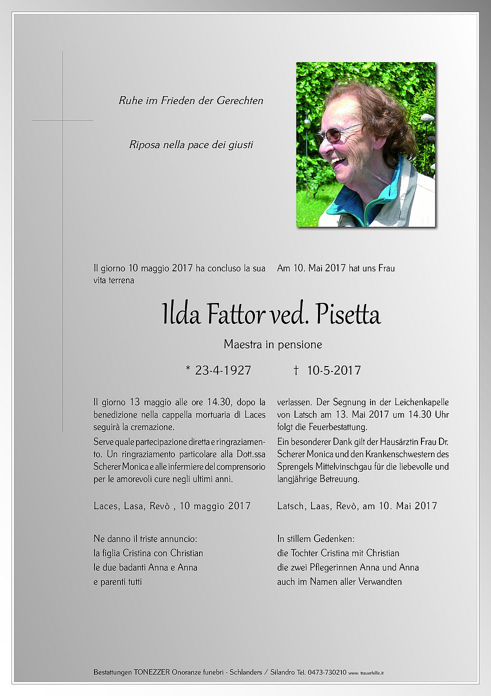 Ein besonderer Dank gilt der Hausärztin Frau Dr. Scherer Monica und den Krankenschwestern des Sprengels Mittelvinschgau für die liebevolle und langjährige Betreuung.