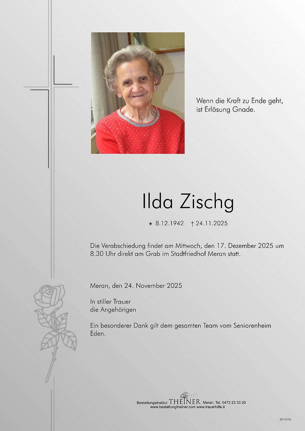 Die Verabschiedung findet am Mittwoch, den 17. Dezember 2025 um 8.30 Uhr direkt am Grab im Stadtfriedhof Meran statt.
