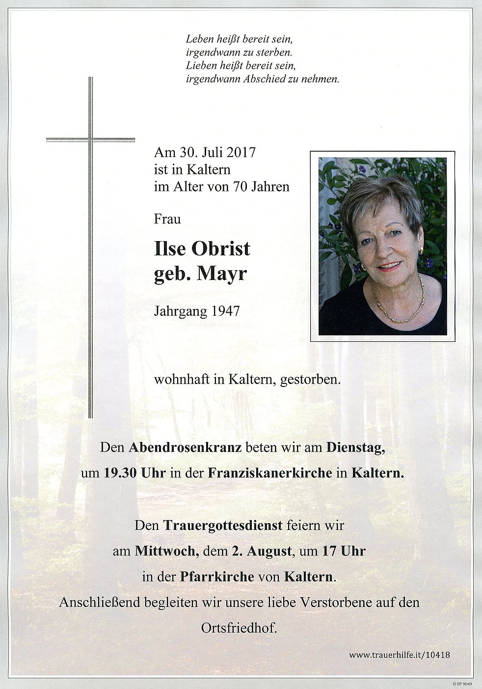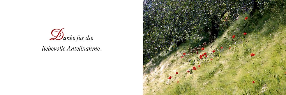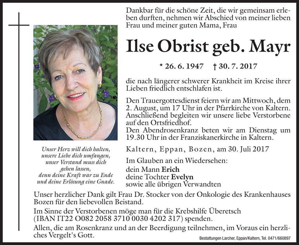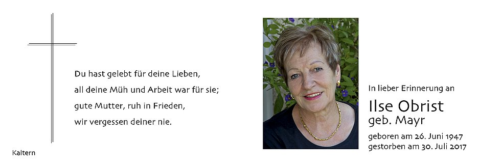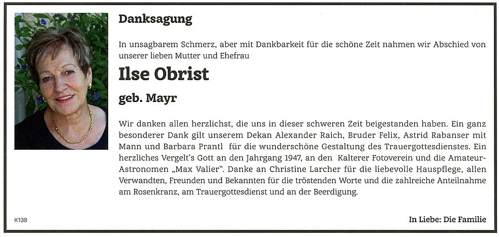 Unser herzlicher Dank gilt Frau Dr. Stocker der Onkologie des Krankenhauses Bozen für den liebevolle Beistand. Allen, die am Rosenkranz und an der Beerdigung teilnehmen, im Voraus ein herzliches Vergelt´s Gott.
