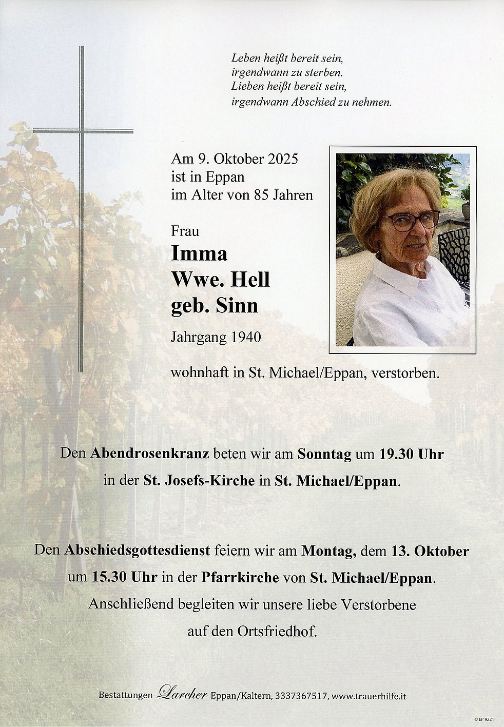 Den Trauergottesdienst feiern wir am Montag, dem 13. Oktober, um 15.30 Uhr in der Pfarrkirche von St. Michael/Eppan. Anschließend begleiten wir unsere liebe Verstorbene auf den Ortsfriedhof.