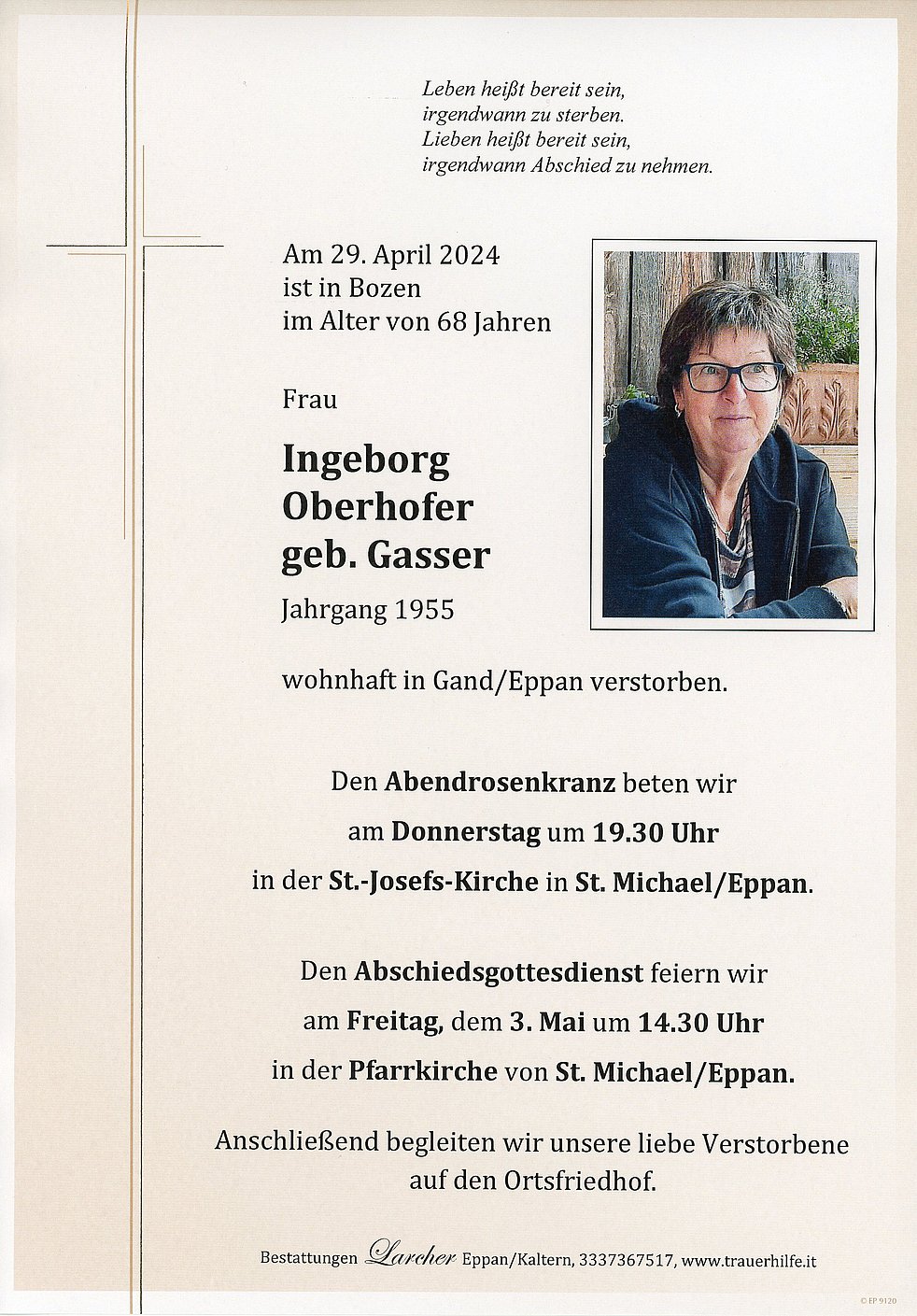 Den Abschiedsgottesdienst feiern wir am Freitag dem 3. Mai, um 14.30 Uhr in der Pfarrkirche von St. Michael/Eppan. Anschließend begleiten wir unsere liebe Verstorbene auf den Ortsfriedhof.