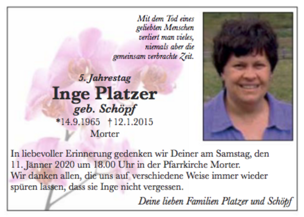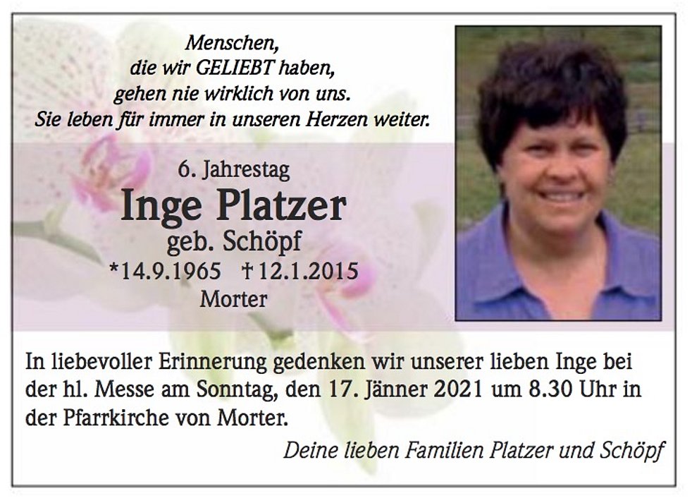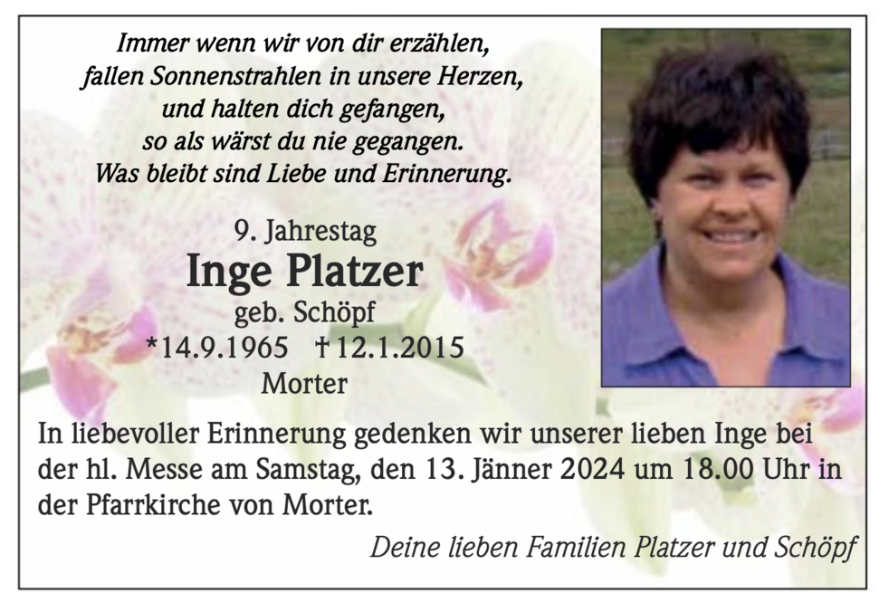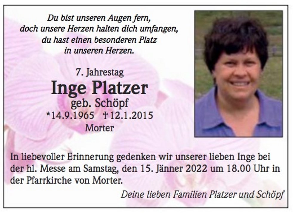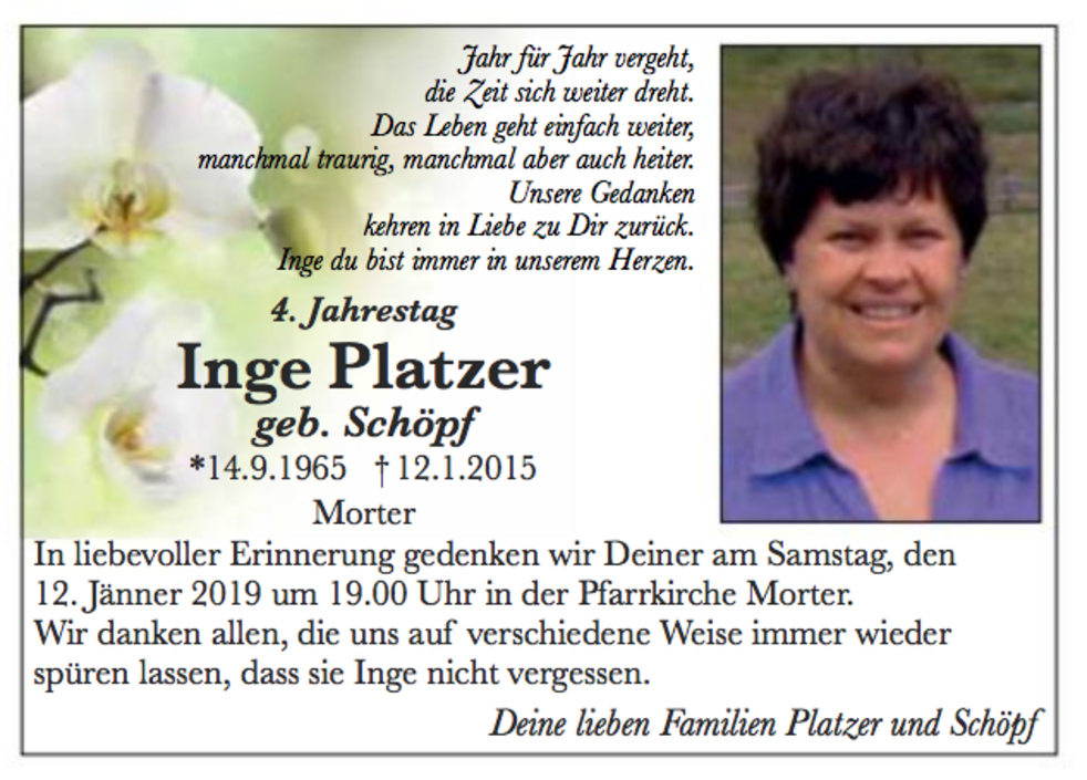 Wir begleiten unsere liebe Inge am Donnerstag, 15. Jänner, um 14 Uhr von der Leichenkapelle aus zum Begräbnisgottesdienst in die Pfarrkirche und anschließend zur letzten Ruhe auf den Ortsfriedhof von Morter.