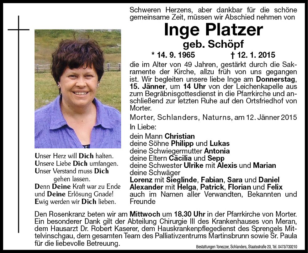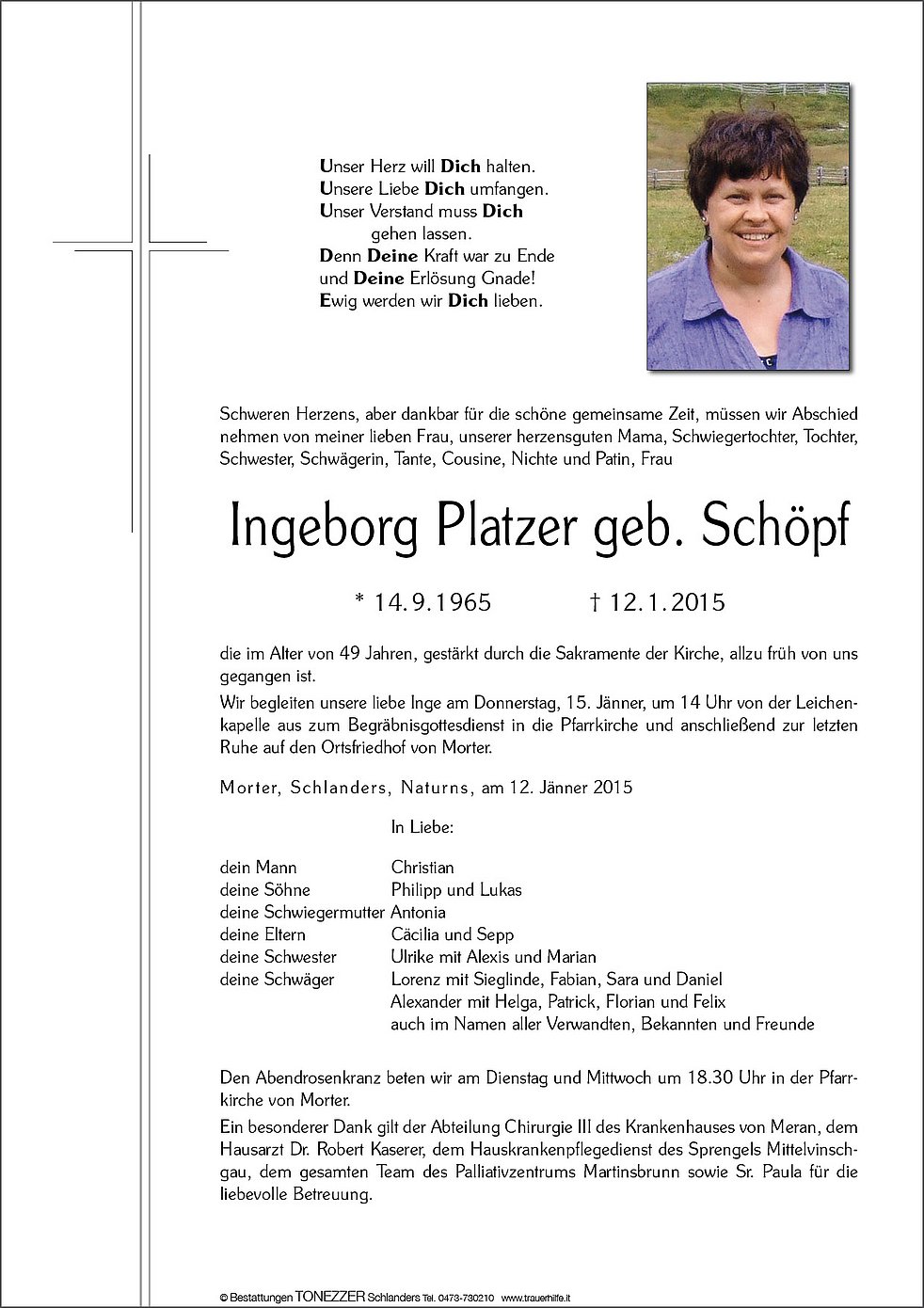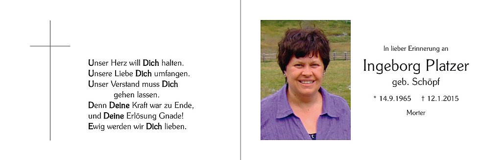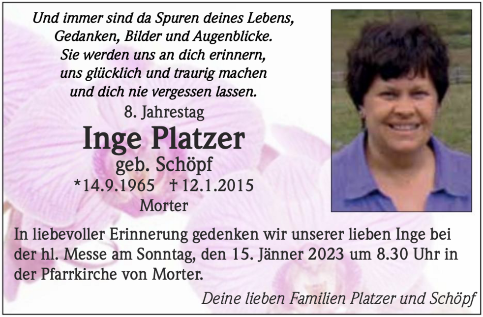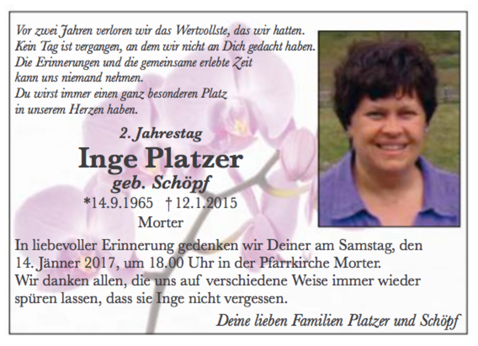 Wir begleiten unsere liebe Inge am Donnerstag, 15. Jänner, um 14 Uhr von der Leichenkapelle aus zum Begräbnisgottesdienst in die Pfarrkirche und anschließend zur letzten Ruhe auf den Ortsfriedhof von Morter.