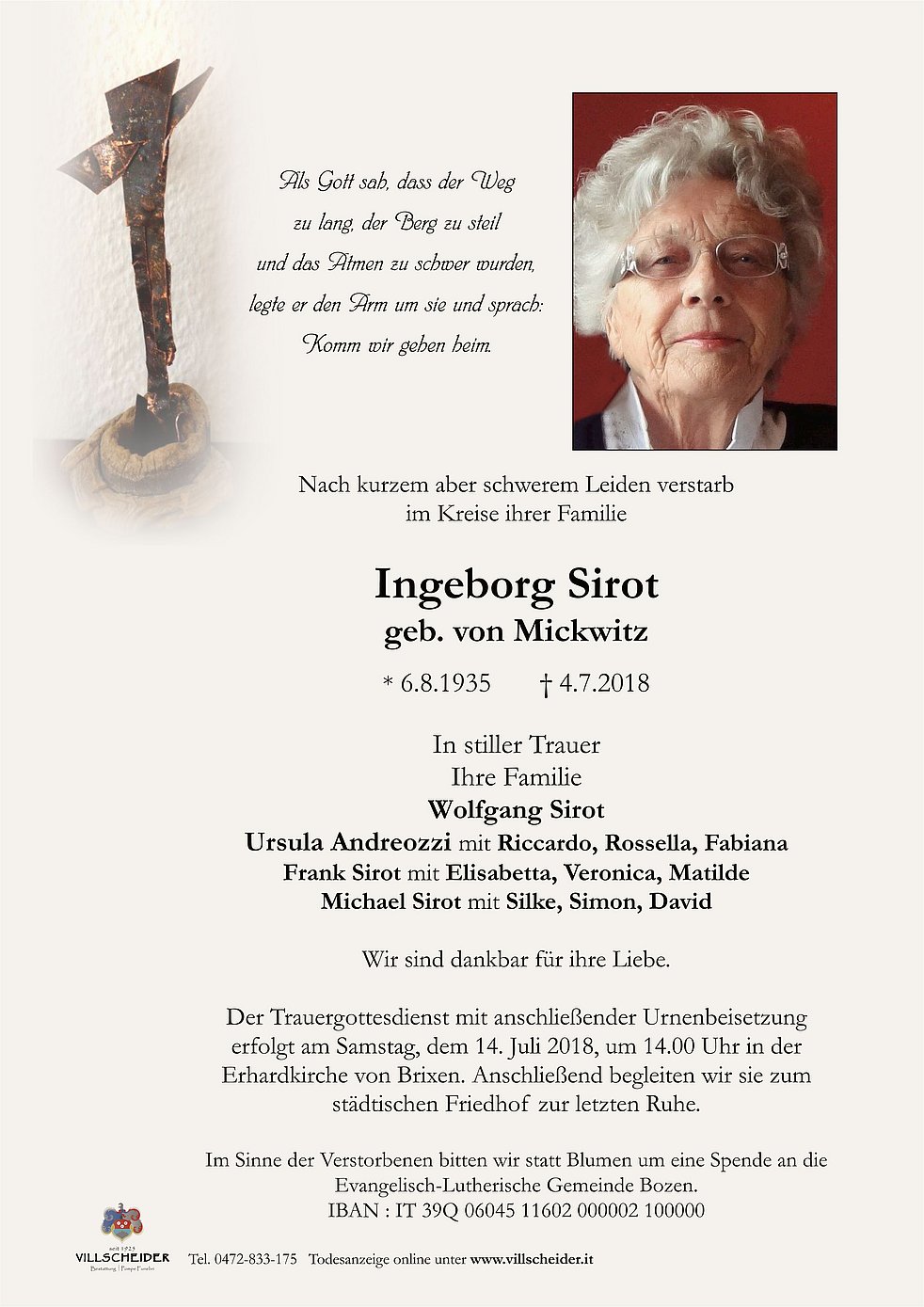 erfolgt am Samstag, dem 14. Juli 2018, um 14.00 Uhr in der Erhardkirche von Brixen. Anschließend begleiten wir sie zum städtischen Friedhof zur letzten Ruhe.