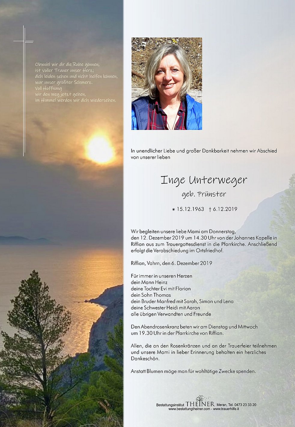 den 12. Dezember 2019 um 14.30 Uhr von der Johannes Kapelle in Riffian aus zum Trauergottesdienst in die Pfarrkirche. Anschließend erfolgt die Verabschiedung im Ortsfriedhof.