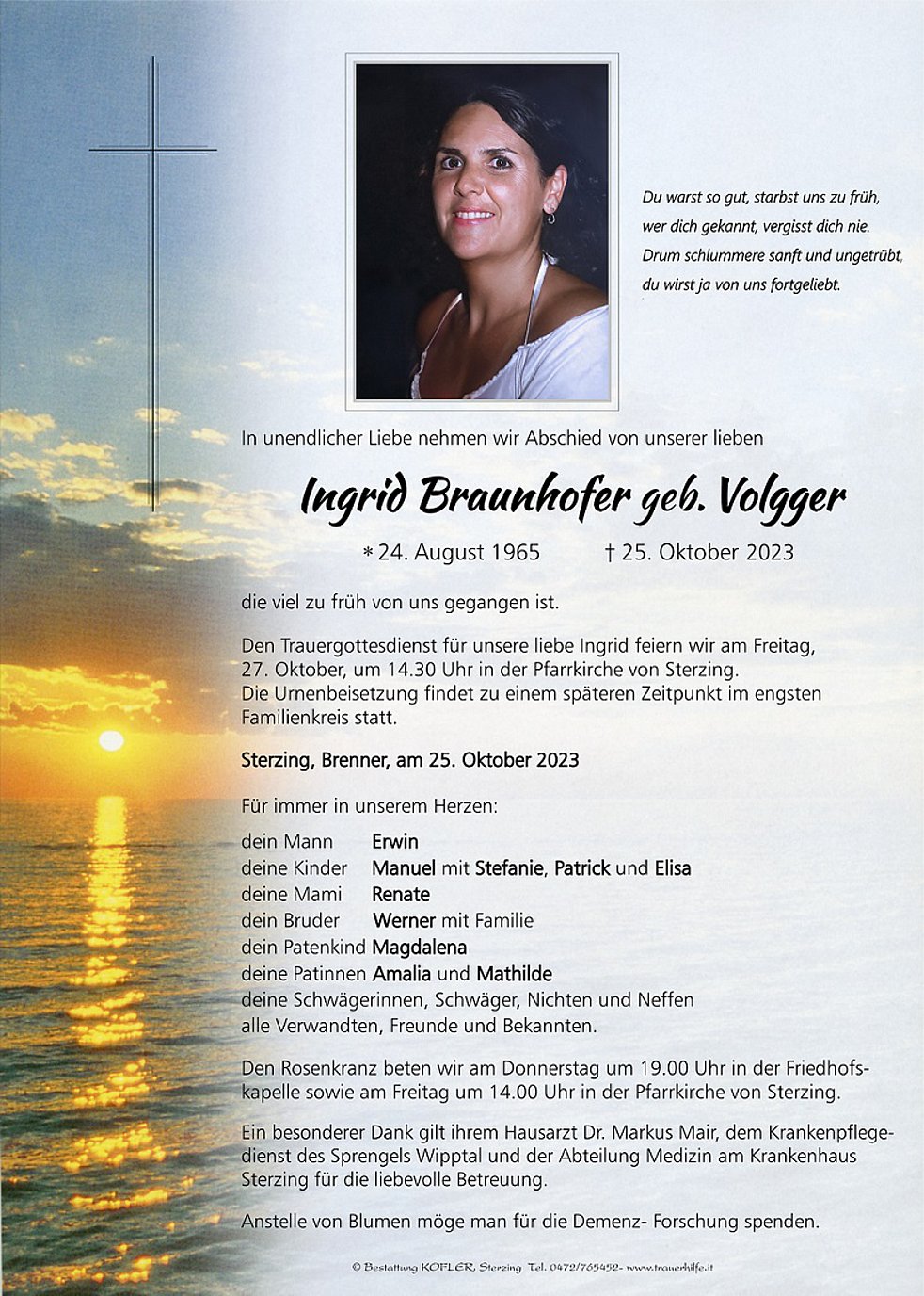 Den Trauergottesdienst für unsere liebe Ingrid feiern wir am Freitag, 27. Oktober, um 14.30 Uhr in der Pfarrkirche von Sterzing. Die Urnenbeisetzung findet zu einem späteren Zeitpunkt im engsten Familienkreis statt.