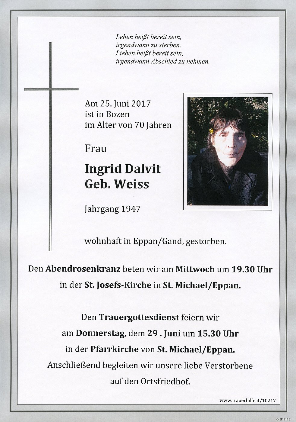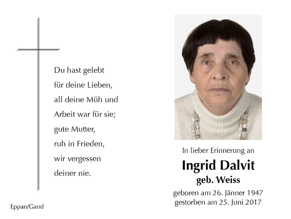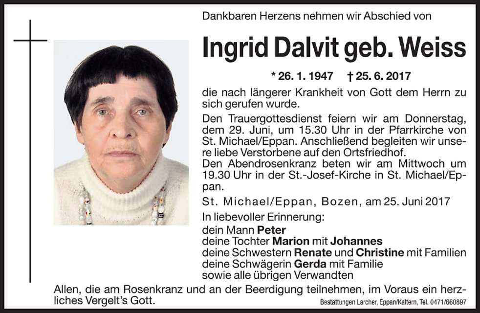 Den Trauergottesdienst feiern wir am Donnerstag, dem 29. Juni um 15.30 Uhr in der Pfarrkirche von St. Michael/Eppan. Anschließend begleiten wir unsere liebe Verstorbene auf den Ortsfriedhof.