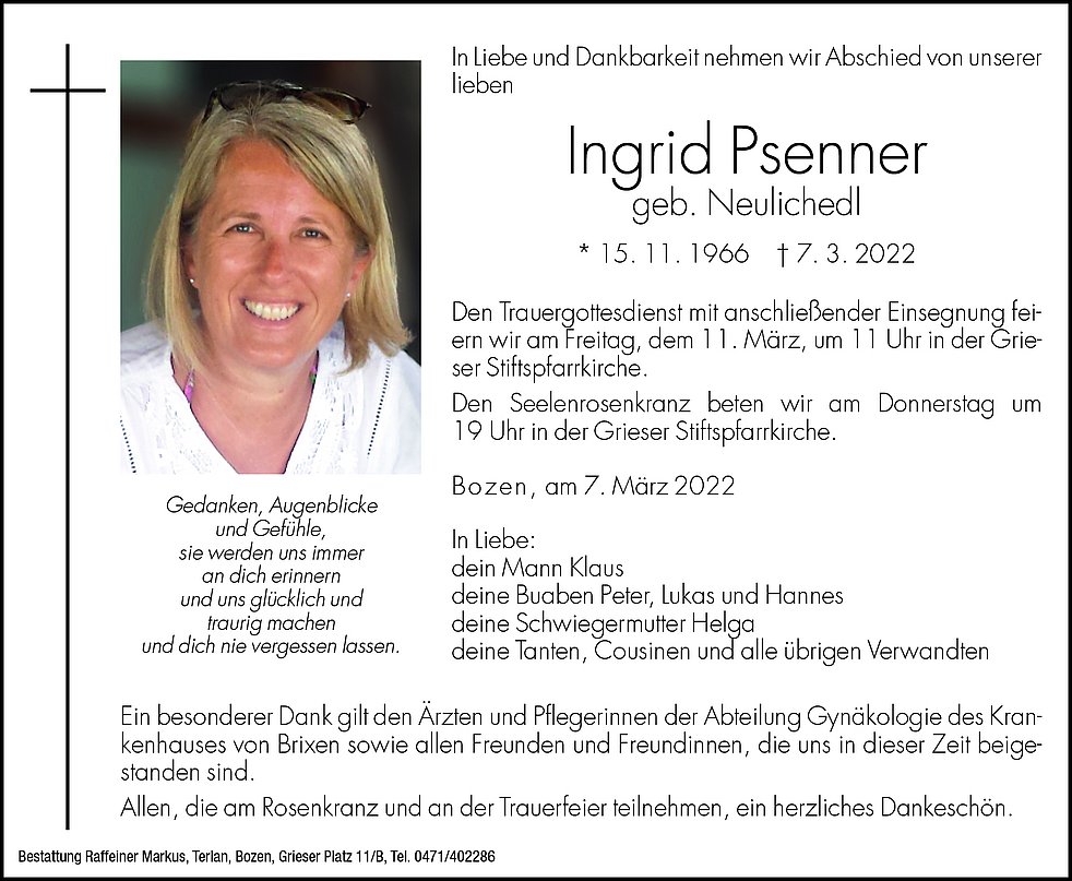 Ein besonderer Dank gilt den Ärzten und Pflegerinnen der Abteilung Gynäkologie des Krankenhauses von Brixen sowie allen Freunden und Freundinnen, die uns in dieser Zeit beigestanden sind.
