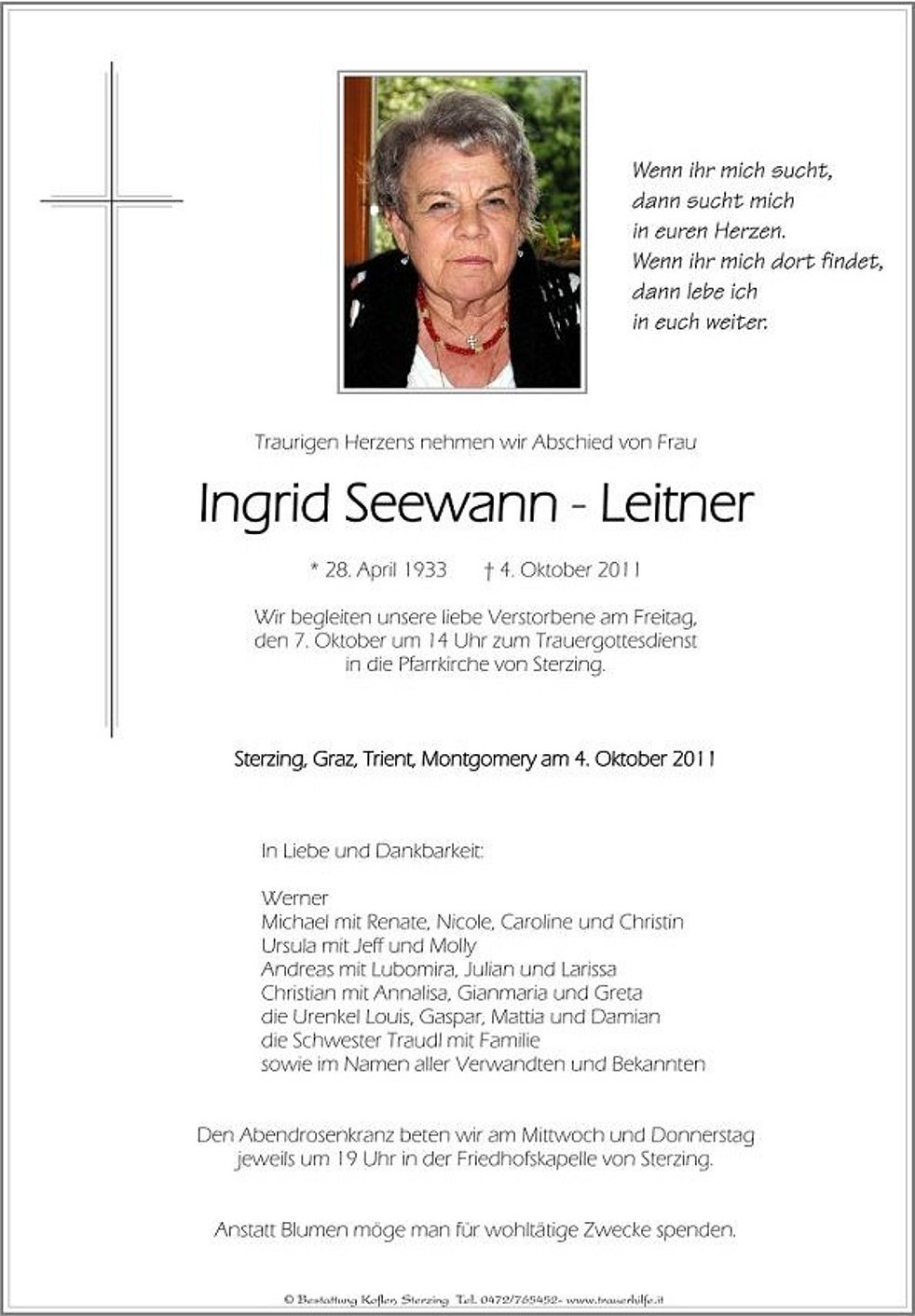 Anstatt Blumen möge man für wohltätige Zwecke spenden.